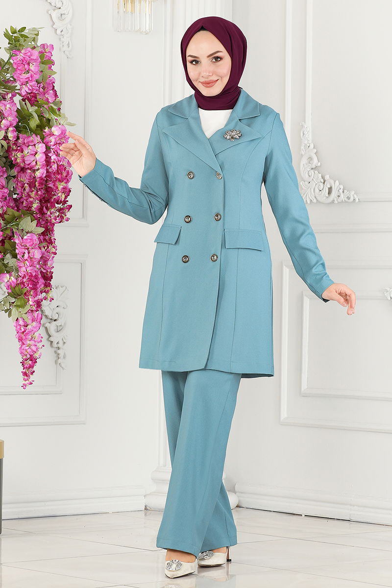 Ürün Özelliği :Yeni sezon tesettür moda ürünüdür. (Astarsızdır.)Ceket yakadır.Önden kullanılabilir düğmeleri bulunmaktadır.Pantolon beli lastiklidir.Cep detayı aksesuardır.Aksesuarlar ürüne dahil değildir.Ürün renginde konsept çekimlerinden dolayı ton farklılığı olabilir.