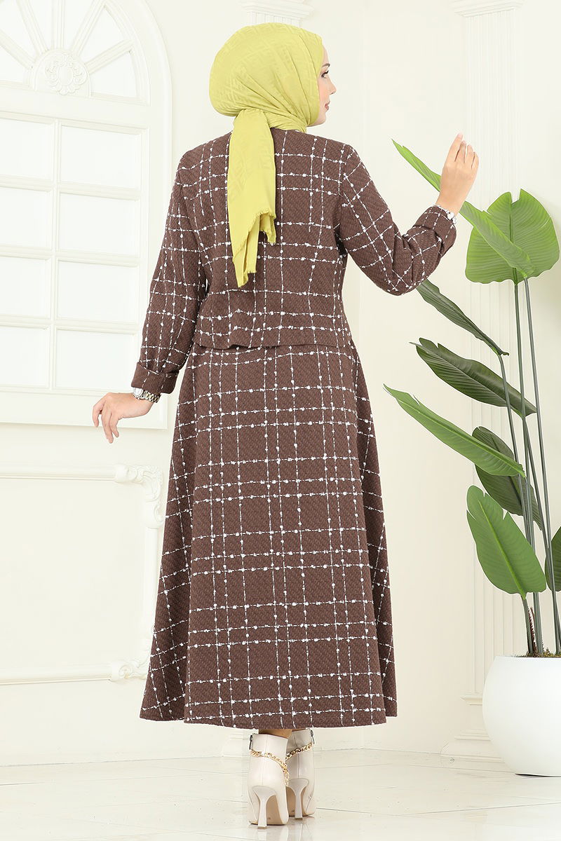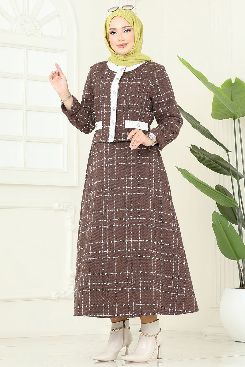 Jacketed Tweed Two-Piece model modest clothing item. It can be used in Autumn and Winter season. It should be washed at 30 degrees without squeezing. It is made of first class Tweed fabric. The product has a Bicycle collar. The product is buttoned from the front. It is unlined. The product has a zip at the waist. (The product on the model is size 38.) There are usable buttons at the front. The waist of the skirt has a zip from the back.