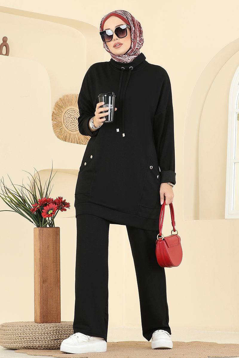 Cep Detay Bağcıklı Takım Siyah