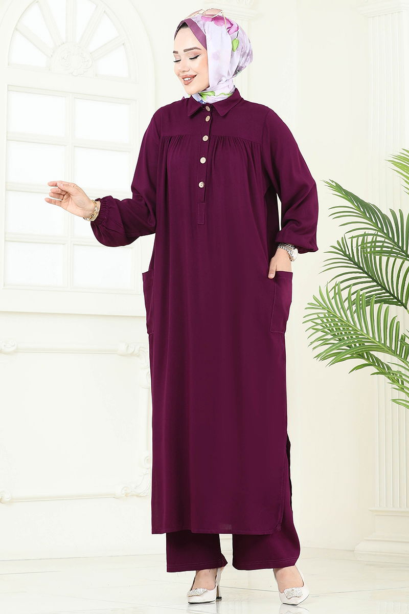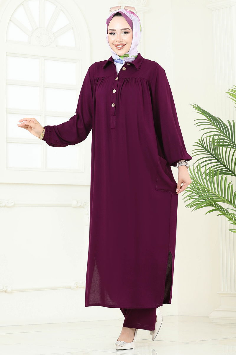المنتج لديه ياقة القميص. المنتج به أزرار نصف أمامي. البلوز تحتوي على فتحة. غير مبطنة. يوجد جيب على البلوز خصر البنطال مرن. السوار مطاطي. قد يكون هناك اختلاف في الدرجة اللونية في المنتج بسبب التقاط الصور الفوتوغرافية.