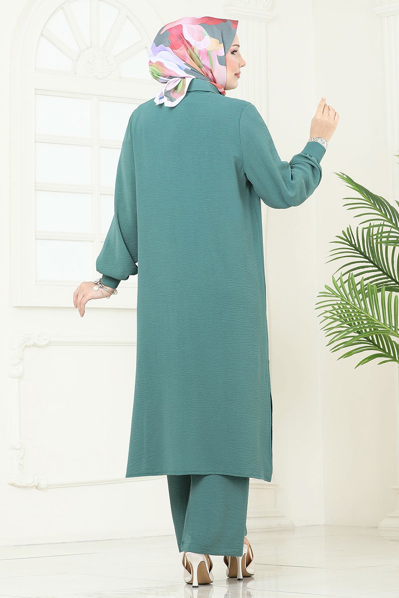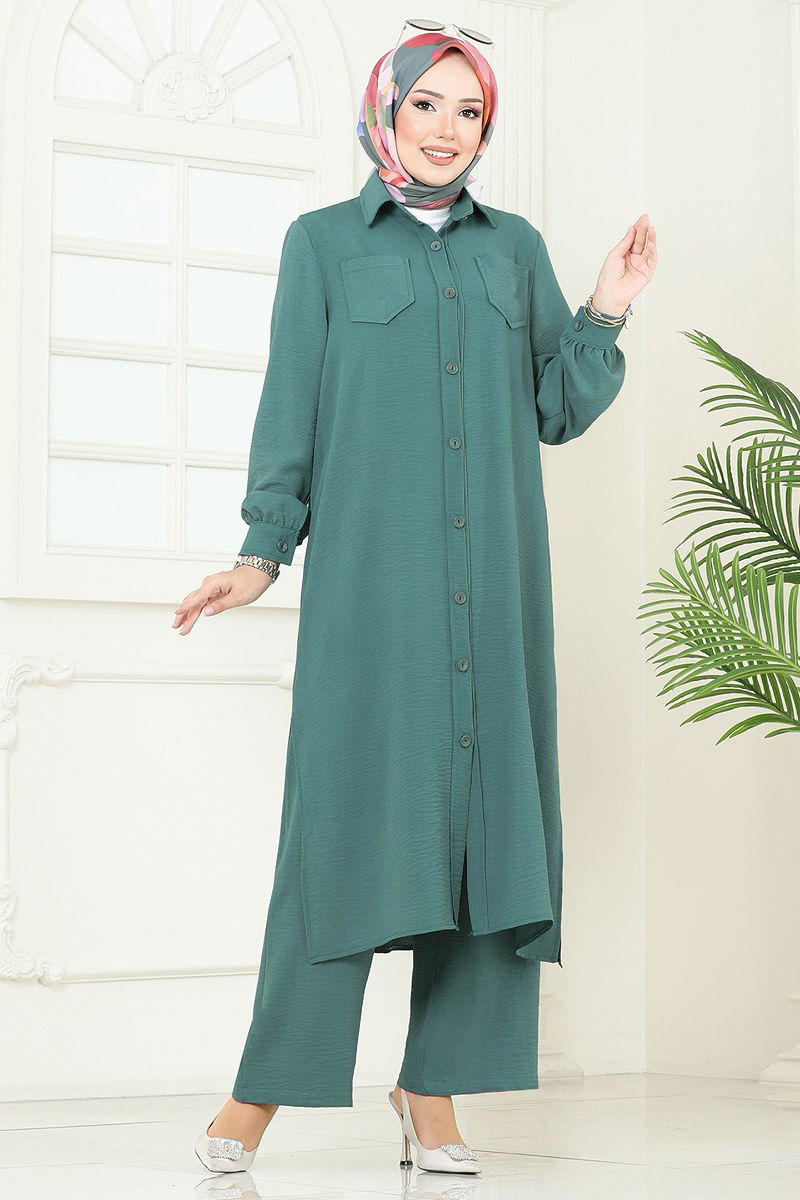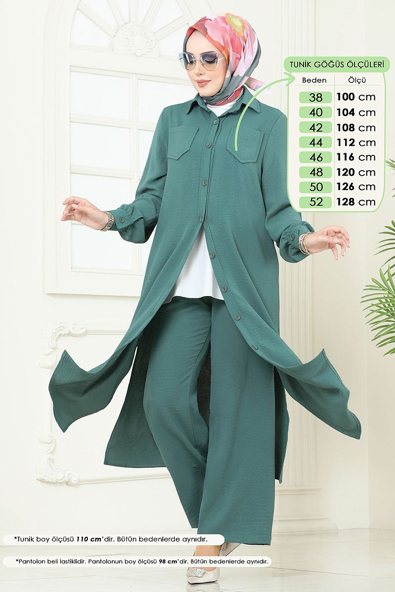 Cep Detaylı Aerobin Takım kombin model tesettür ürünüdür. Dört mevsim sezonunda rahatlıkla kullanabilirsiniz. Hassas yıkama tercihi ile 30 derecede yıkanabilir. Aerobin kumaş kullanılarak üretilmiştir. Gömlek yaka ve ön düğme özellikleri ile şık ve kullanışlıdır. Tunik yan yırtmaçlı ve astarsızdır, konfor sunar. Pantolon beli lastikli olduğu için rahat bir kullanım sağlar. Göğüs cebi aktif, manşet düğmeleri ile detaylandırılmıştır.