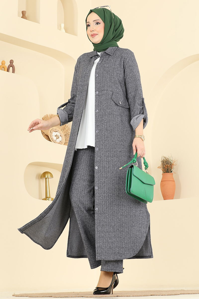 Cep Detaylı Balıksırtı Takım, özellikle sonbahar ve kış ayları için uygun bir tesettür ürünüdür. Balıksırtı desenli kumaşından imal edilmiş bu takım, hem şık hem de konforlu bir giyim deneyimi sunar. Ürün, hafif bir yapıya sahip olup gömlek yaka ve gizli düğmelere sahiptir. Tunik yan yırtmaçlara ve gizli ceplerle işlevselliği artırılmış, beli dikişli ve pantolon beli lastiklidir. Manşetlerde apolet düğmeleri bulunmaktadır ve cep detayları aksesuardır. Hassas yıkama gerektiren bu ürün, 30 derecede yıkanabilir.
