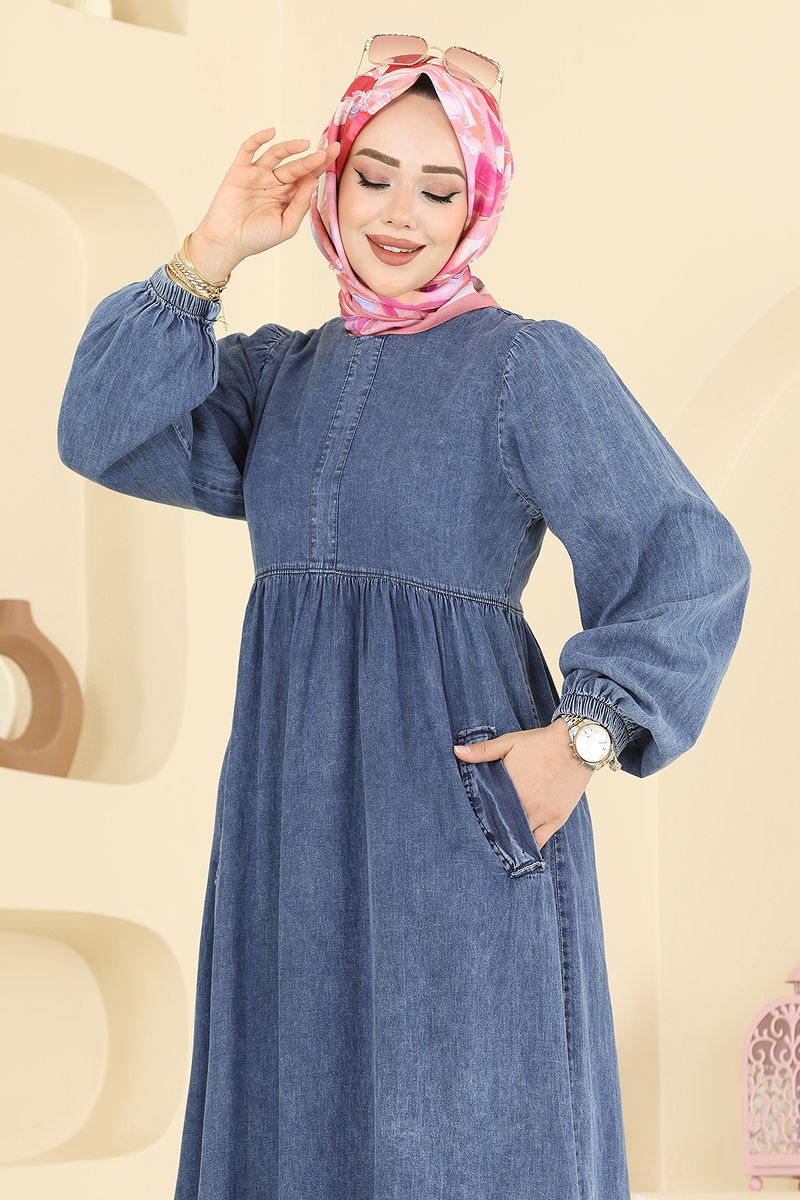 Şık ve kullanışlı Cep Detaylı Kot Elbise! Bu dört mevsim giyilebilen tesettür elbise, bisiklet yakası ve arka fermuarı ile hem modern hem de rahat bir kullanım sunar. Astarsız yapısı sayesinde hafif ve konforludur. Özel tasarımlı cepleri ve lastikli manşetleri ile fonksiyonel bir şıklık sağlar. 30 derecede hassas yıkama yapılabilir.