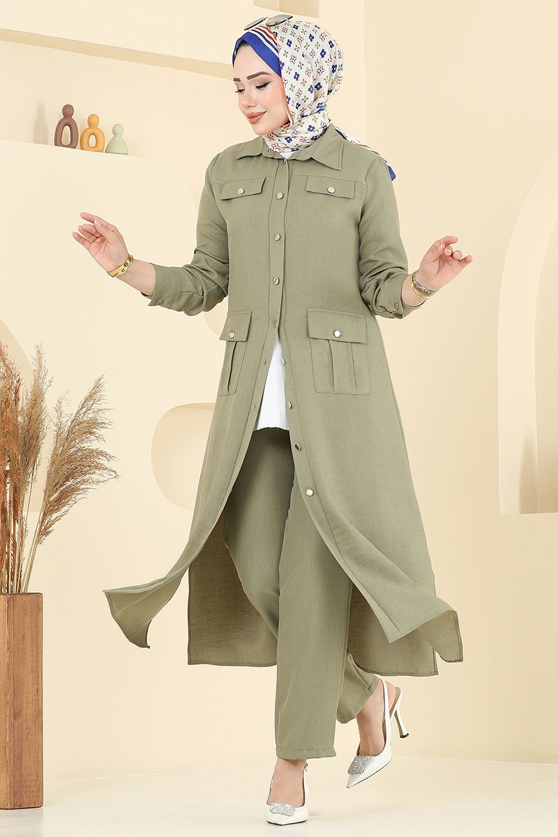 Cep Detaylı Sofia Takım, tesettür kesimiyle modern ve şık bir görünüm sunuyor. Dört mevsim rahatça kullanabileceğiniz bu takım, sofia keten kumaştan üretilmiştir. Gömlek yaka tasarımı ve önden düğmeli yapısıyla pratik bir kullanım sağlar. Tunikteki yandan yırtmaçlar hareket özgürlüğü sunarken, pantolonun lastikli beli konforu artırır.Tunikte bulunan cepler, kullanışlı detaylar ekler. Manşetlerdeki aktif düğmeler ise şıklığı tamamlar. Ürün, 30 derecede hassas yıkama ile temizlenebilir.