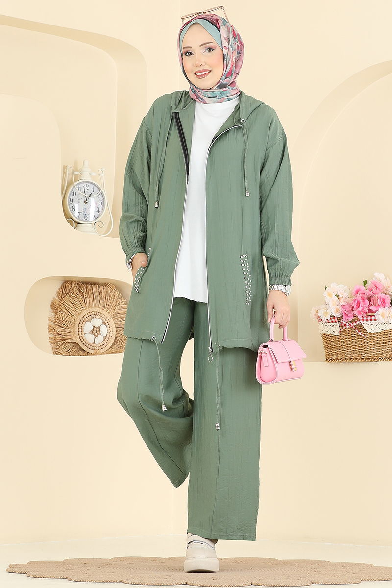 Ürün Özelliği : Yeni sezon tesettür moda ürünüdür. Yaka bağcık aktiftir. Ürün Kapşonlu yakadır. Astarsızdır. Ürün Önden fermuarlıdır. Taş detayları çakımdır. Kapşon ürüne dikilidir. Cep mevcuttur. Pantolon beli lastiklidir. Konsept fotoğraf çekimlerinden dolayı üründe ton farklılığı olabilir.