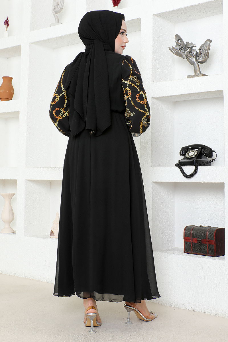 فستان شيفون بأكمام منقوشة باللون الذهبي