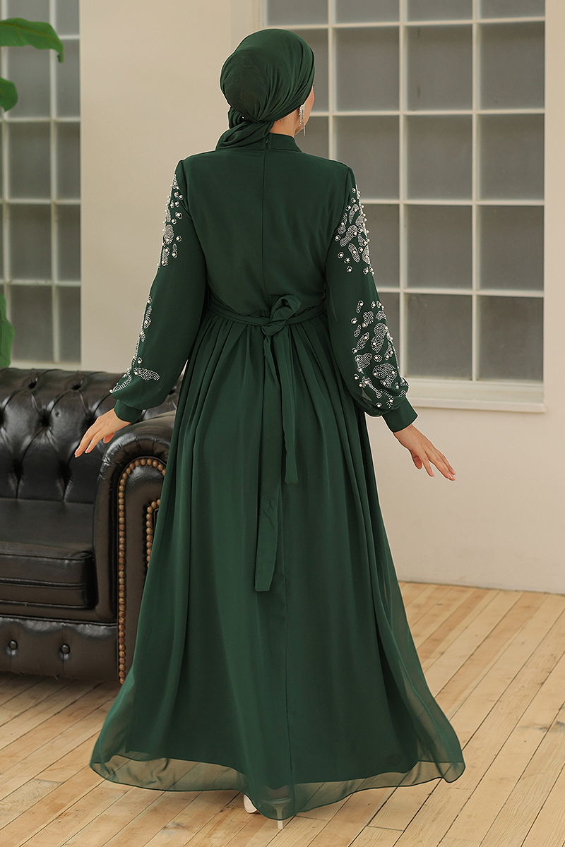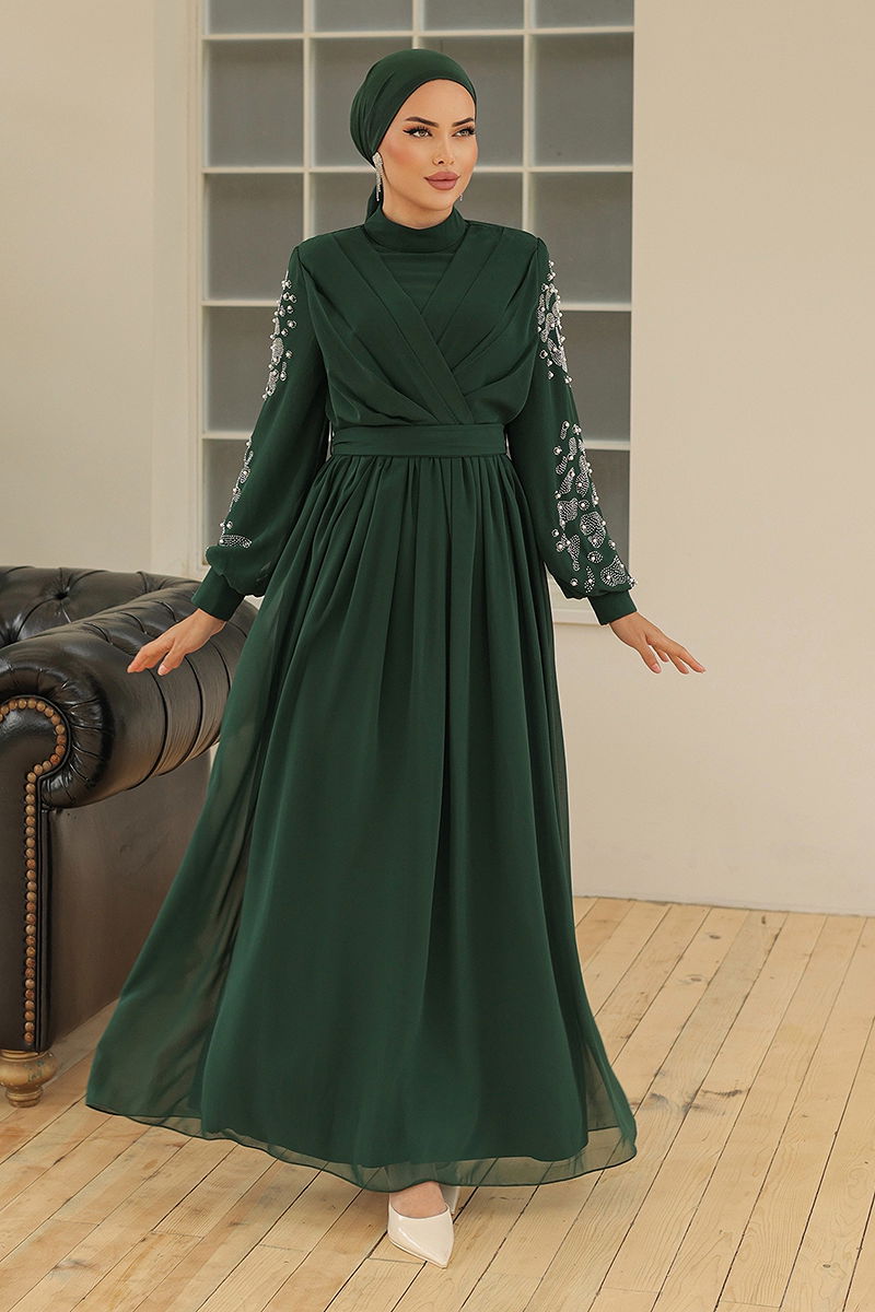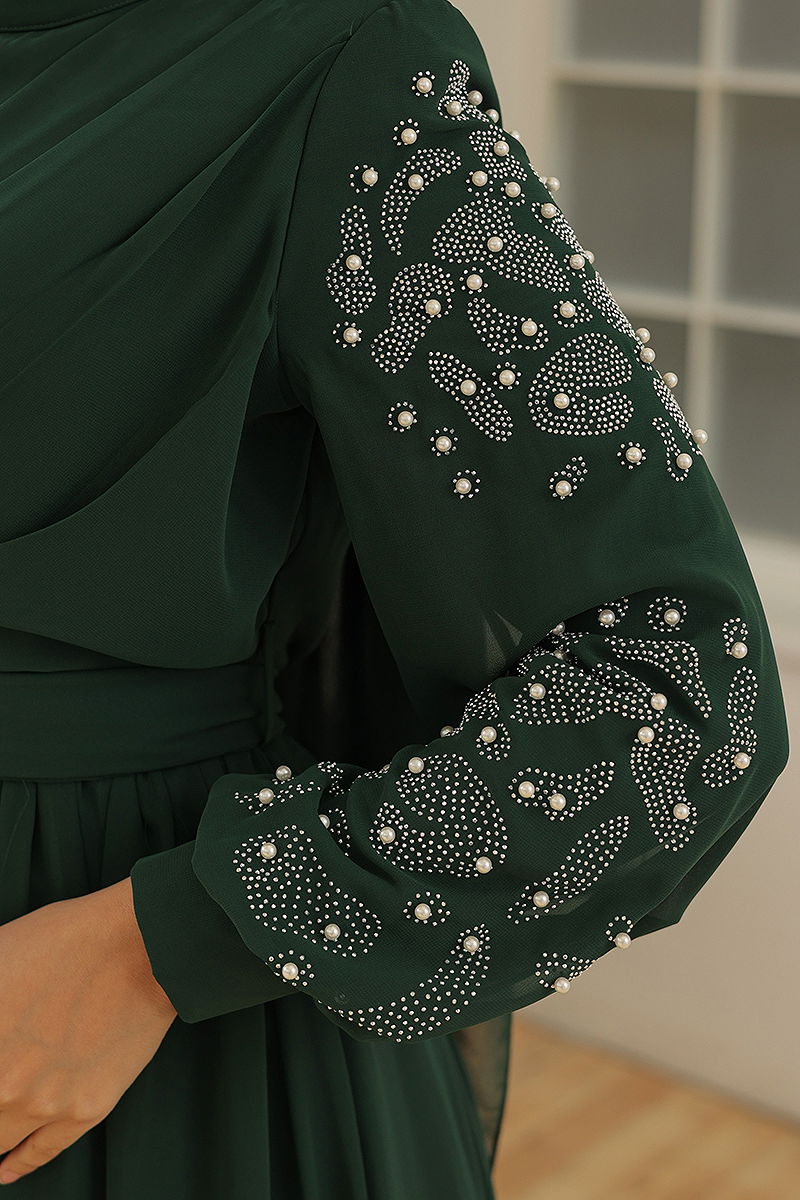 Chiffon Evening Dresses with Embroidered Sleeves Emerald