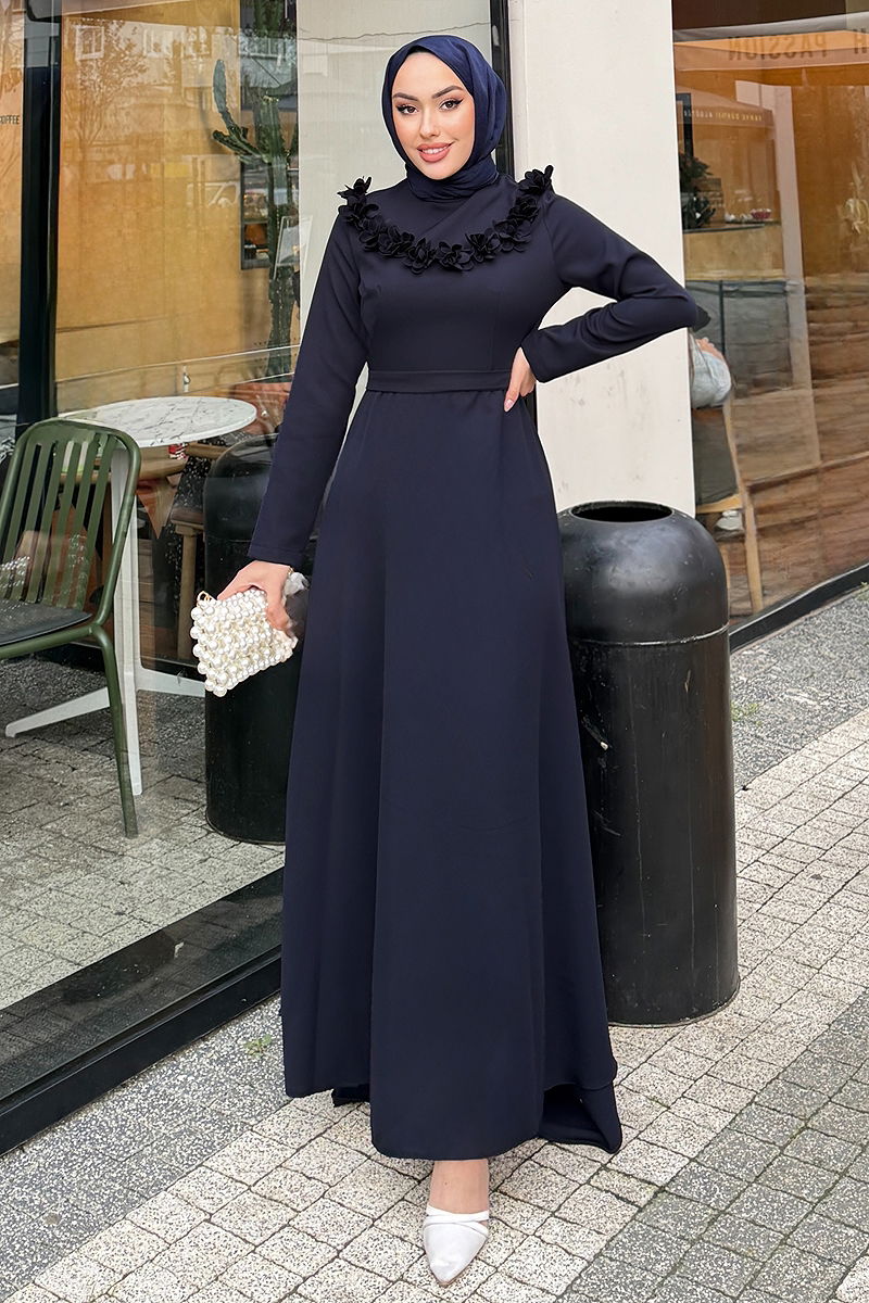 Şıklığı ve konforu bir arada sunan Çiçek Aksesuarlı Şık Elbise, dört mevsim boyunca keyifle giyilebilir. Tesettür tasarımıyla dikkat çeken bu elbise, sadece kuru temizleme ile bakımı yapılabilir. Yarım hakim yaka detayına sahip olan bu şık parça, astarsız tasarımı ve sırttan fermuarlı yapısıyla pratik kullanım imkanı sunar. Ürünün 38 beden örneği üzerinde gösterilmektedir. Etek kısmında kullanılan kemer, dalgalanmayı önleyecek şekilde tasarlanmış olup, kullanımı isteğe bağlıdır. Kemerin iki ucu sabitlenmiş, orta kısmı ise dikişsiz bırakılmıştır.
