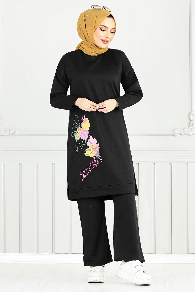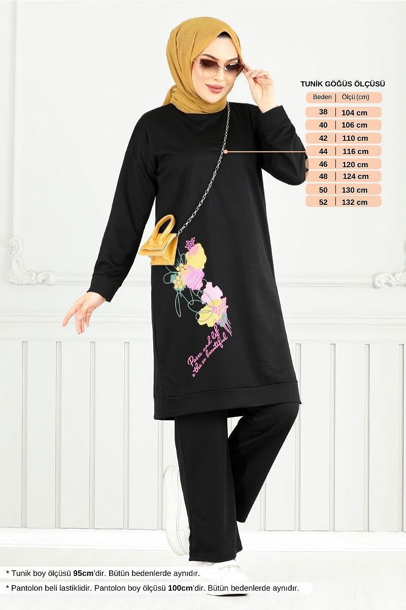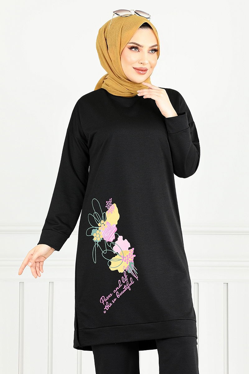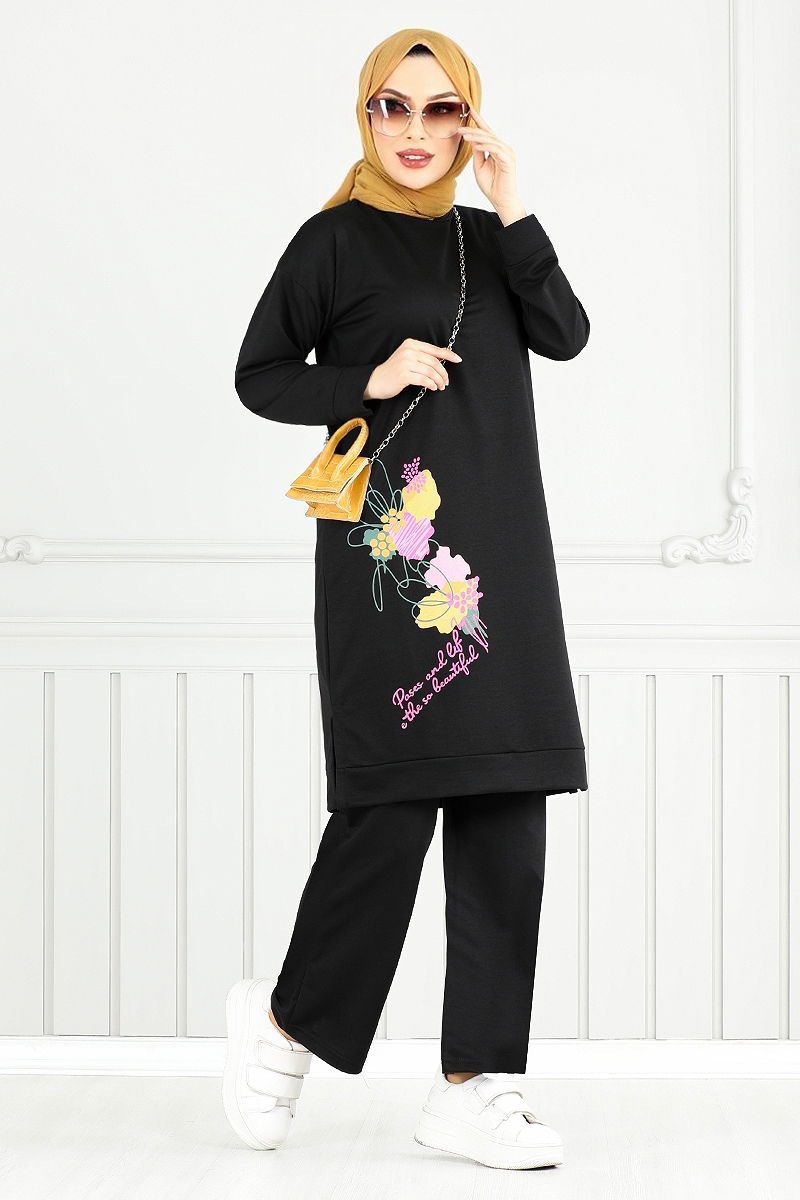 Çiçek Baskılı Tesettür Takım 5093UZ1029-M Siyah