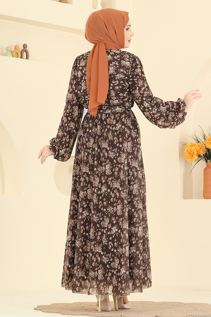 Çiçek Baskılı Tül Elbise 5750EDF311 Kahve