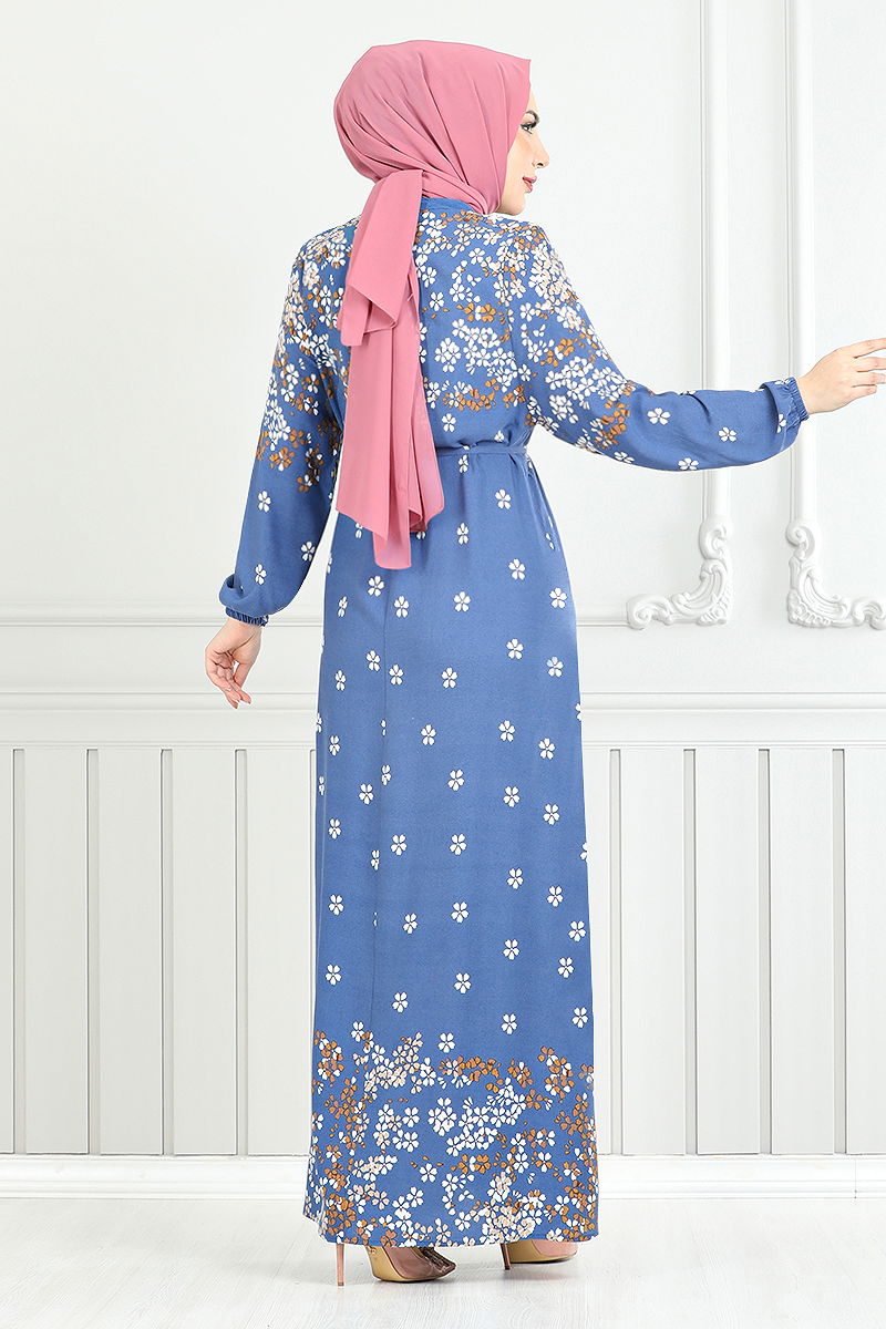 Çiçek Desen Viskon Elbise İndigo