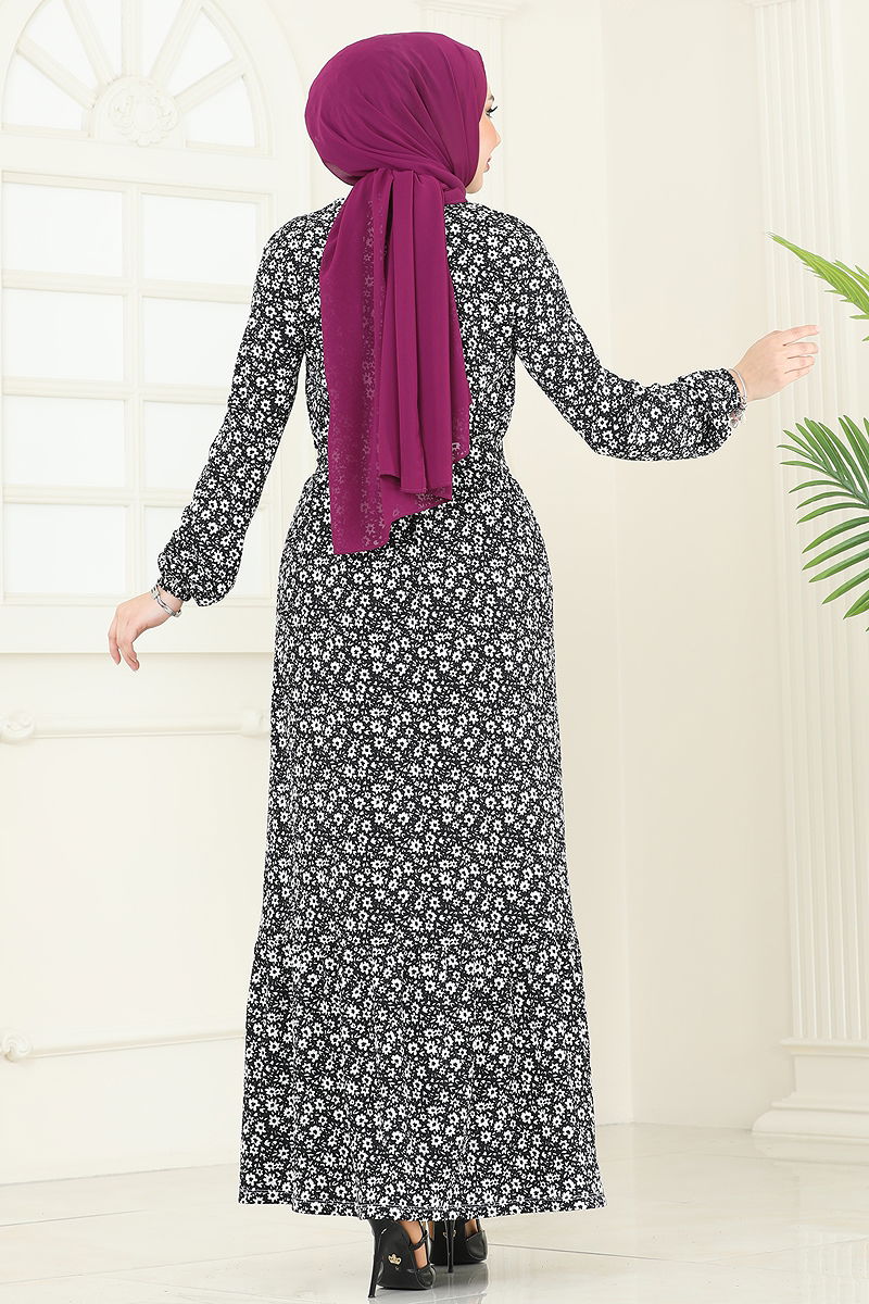 The Floral Pattern Crimp Dress is a chic modest wear suitable for all seasons. This dress, which can be washed at 30 degrees on a gentle cycle, is made from durable crimp fabric. It features a crew neck and a lining-free design for a modern look. The dress comes with an elastic cuff and includes a belt that can optionally be left unused. The length of the dress is 167 cm, with measurements of 90 cm chest, 70 cm waist, and 100 cm hips. This stylish and comfortable choice will make you stand out in any setting.