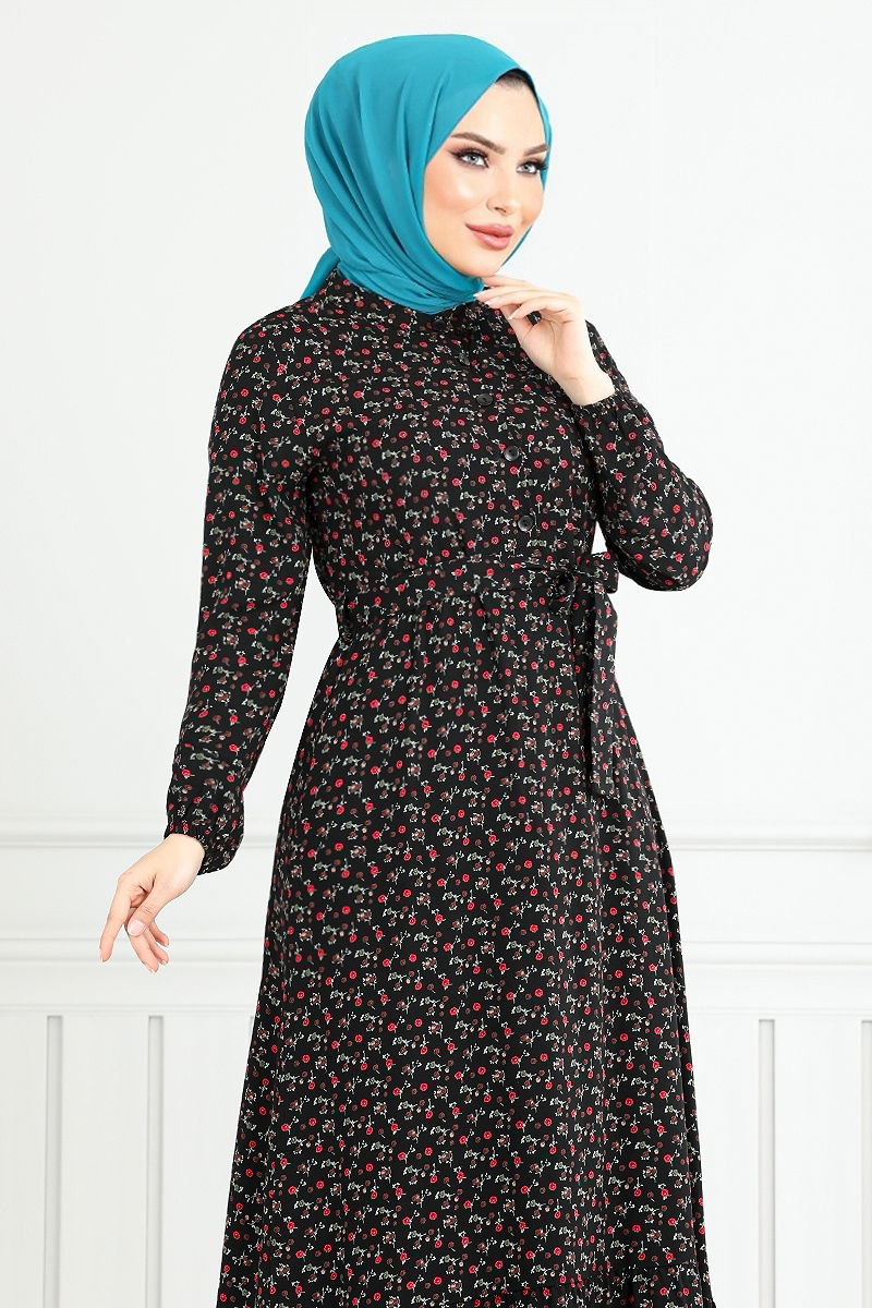 Çiçek Desenli Elbise 4069ZNN894-M Siyah