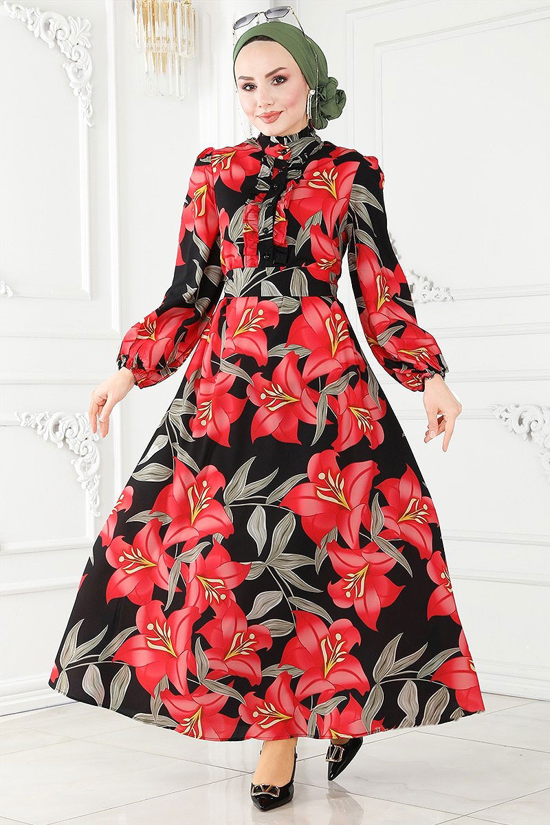 Çiçek Desenli Poplin Elbise 23150JNF844 Nar Çiçeği&Siyah