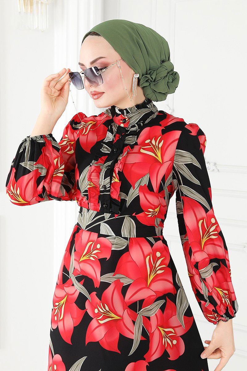 Çiçek Desenli Poplin Elbise Nar Çiçeği&Siyah Özellikleri