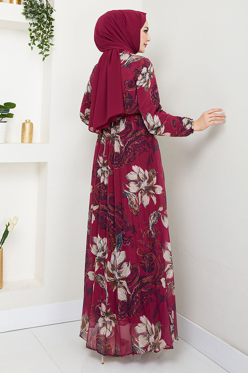 Çiçek Desenli Tesettür Elbise 5035ANT904-M Vişne