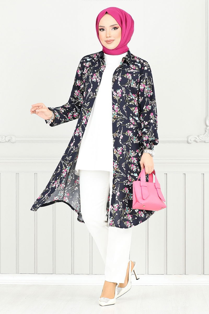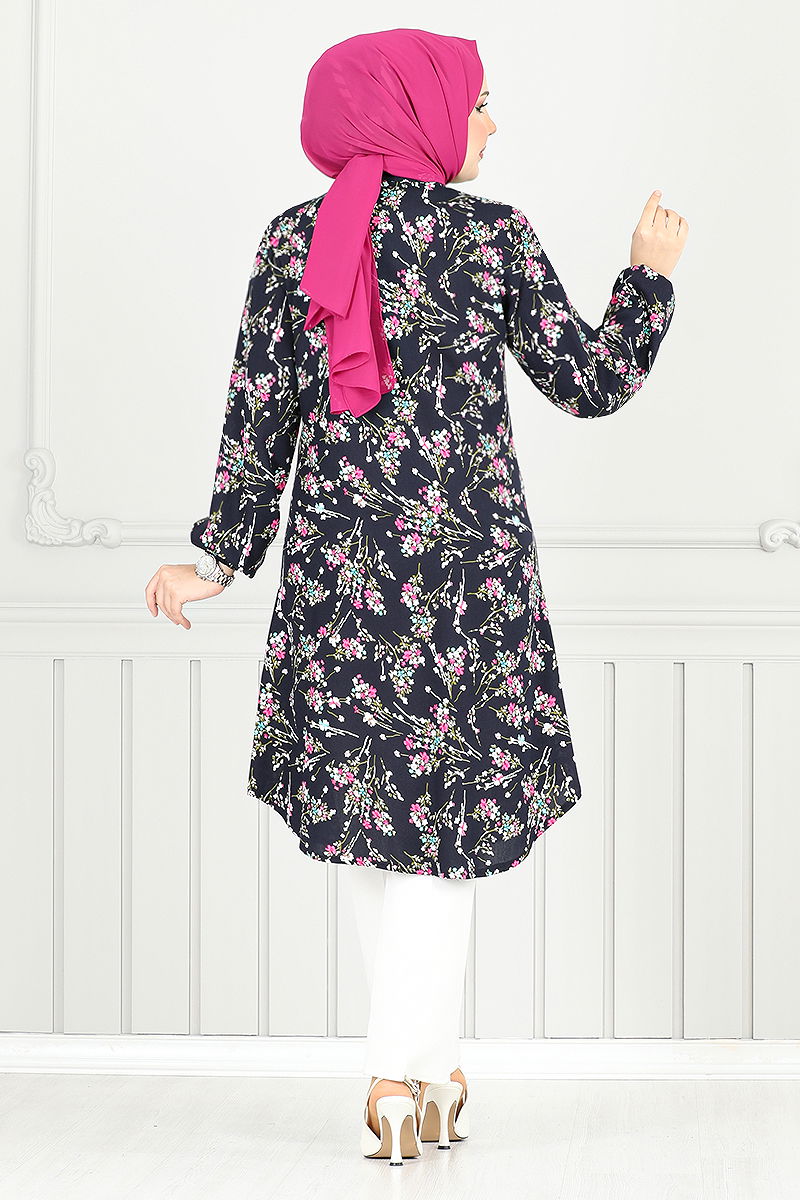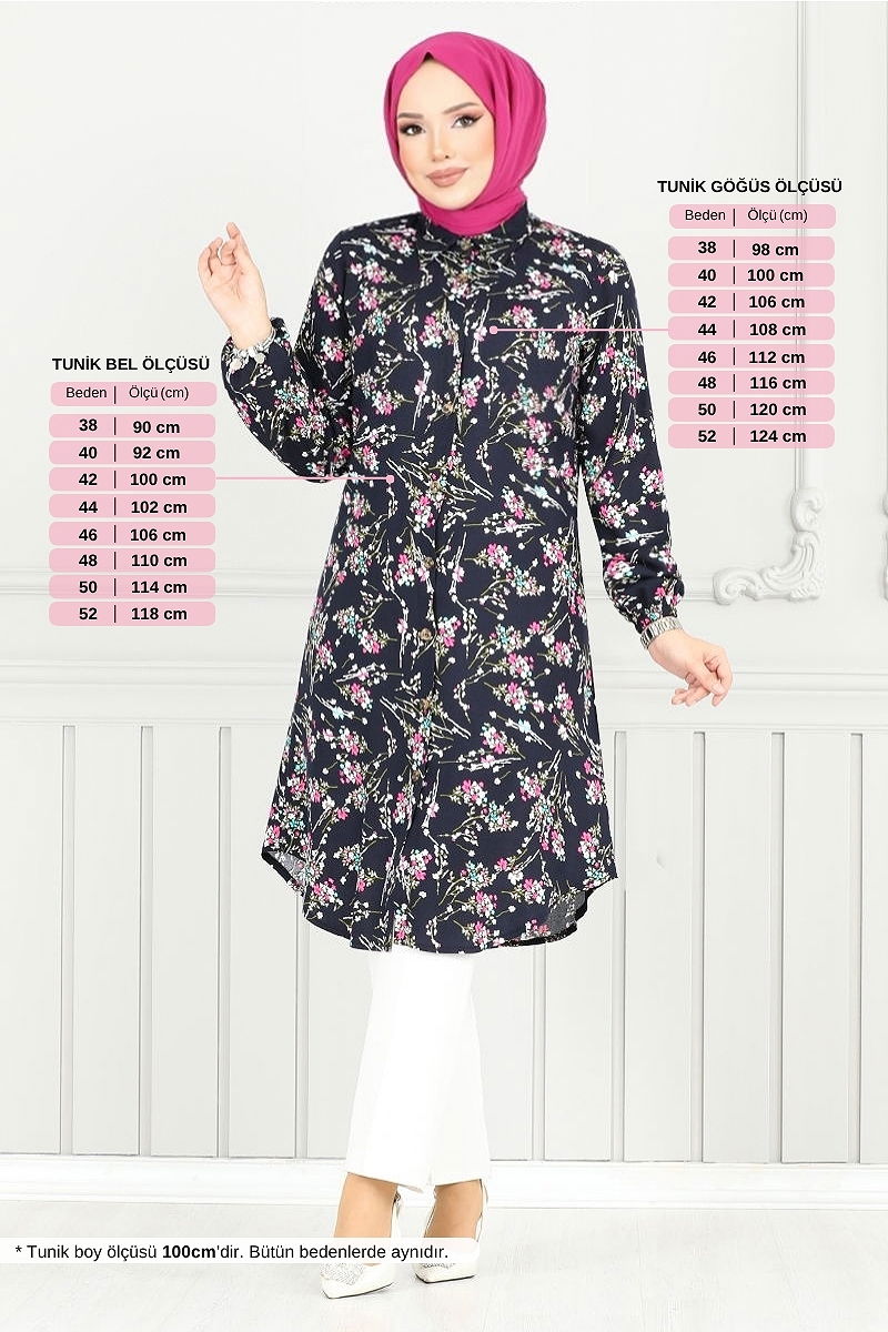 Floral Pattern Hijab Tunic, made of viscose fabric, can be comfortably worn in all seasons. Recommended to be hand washed, this product offers both stylish and practical use with its shirt collar design and front button style. The elastic cuff detail combines convenience and comfort. The tunic is unlined and the size demonstrated on the model is 38.