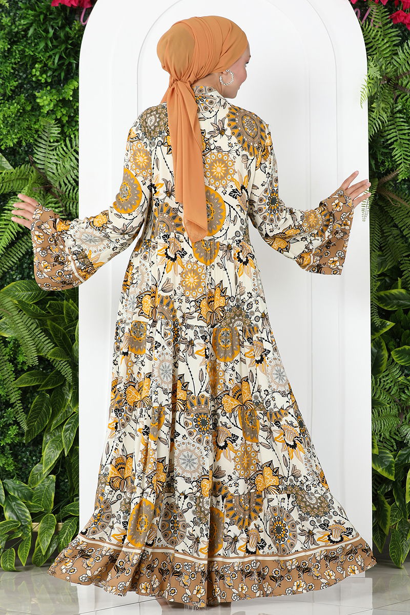 Çiçek desenli viskon elbise, ilkbahar ve yaz sezonları için mükemmel bir seçenektir. Elde yıkanabilen birinci sınıf viskon kumaştan üretilmiştir. Yarım hakim yakaya sahip olan bu elbise önü düğmeli ve astarsızdır. Modelin üzerindeki ürün 38 bedendir. Laci, Mavi, Mint, Siyah, Vizyon gibi renk seçenekleri ve 38-50 beden aralığında farklı beden seçenekleri bulunmaktadır.