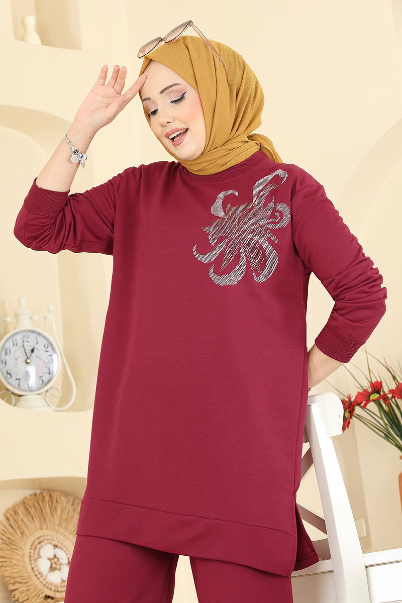 Çiçek Detaylı İki İplik Takım Bordo