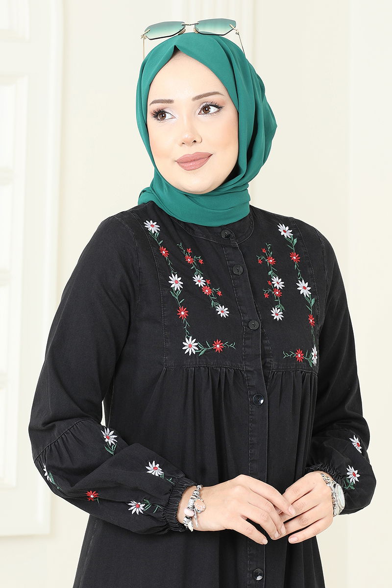 Çiçek Detaylı Kot Elbise Siyah Kot