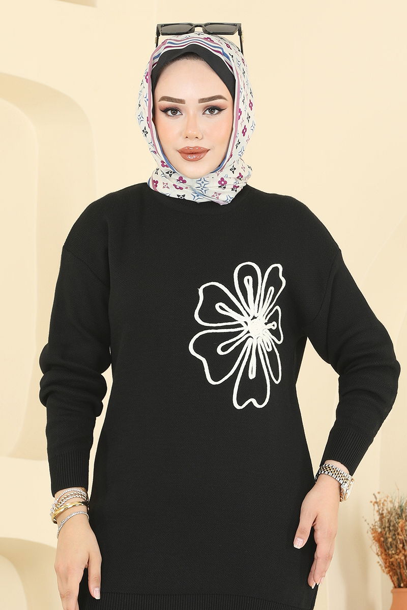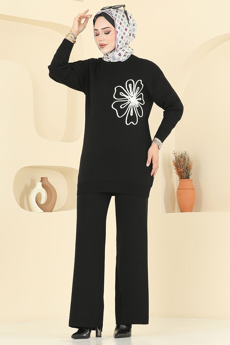 Çiçek Detaylı Triko Takım Siyah