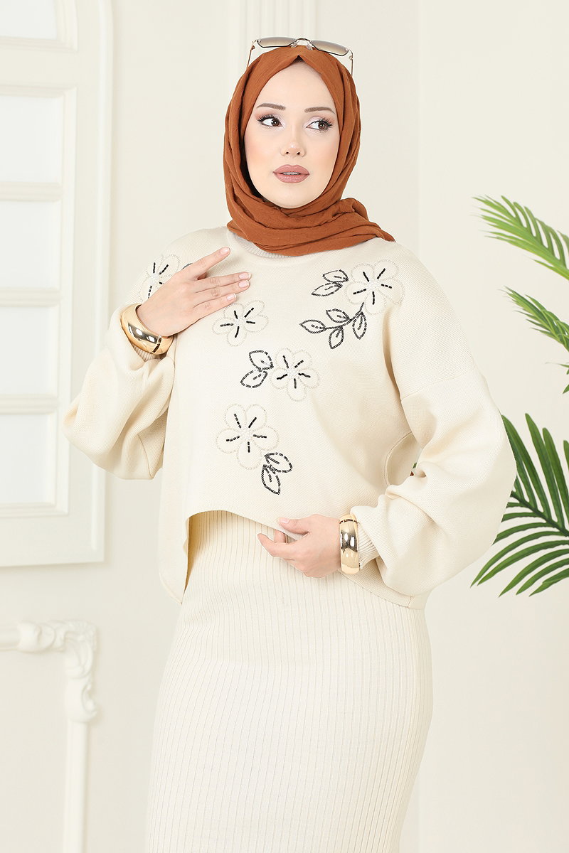 Sonbahar ve Kış aylarına özel tasarlanmış Çiçek Motifli Elbiseli Takım KOMBİN, tesettür gardırobunuzun vazgeçilmezi olacak. Hassas yıkamaya uygun, 30 derecede yıkanabilen bu takım, triko kumaşı sayesinde gün boyu konfor sunar. Yarım boğaz yakası ve astarsız tasarımı ile rahat bir kullanım sağlar. Boncuk detayları ile göz alıcı bir şıklık sunan tunik ve elbise, 36'dan 44 bedene kadar olan standart bedenlere uygundur.