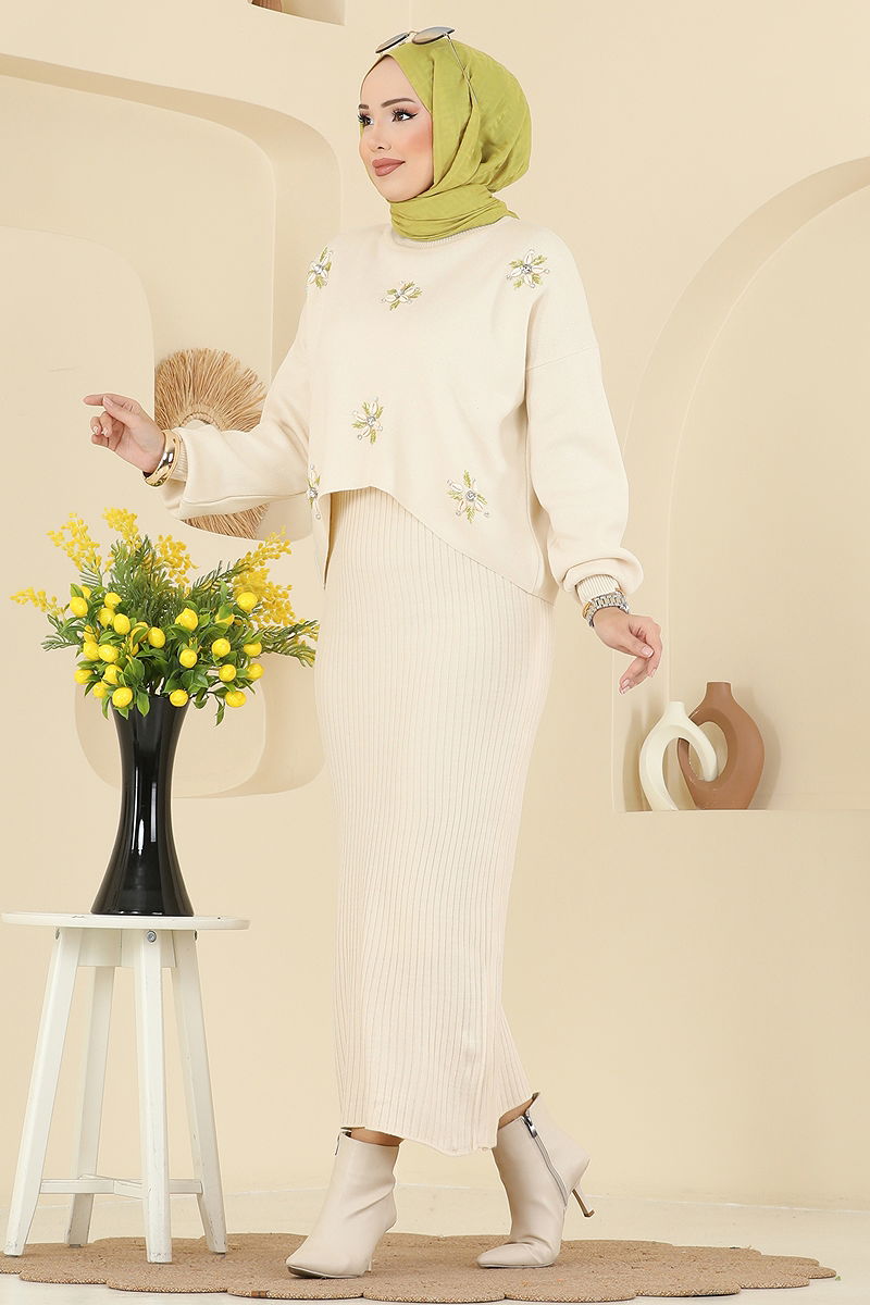 Çiçek Motifli Triko Takım 1402MT581 Taş