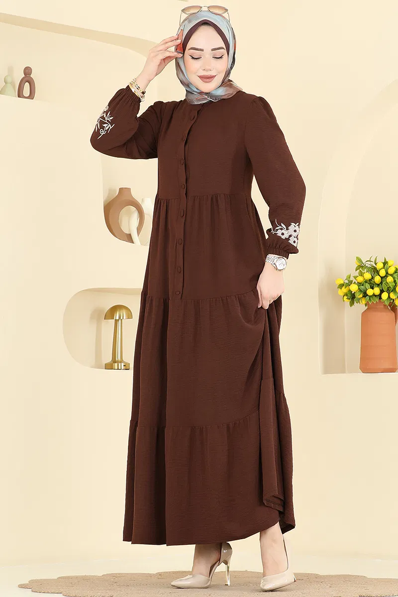 Çiçek Nakışlı Ayrobin Elbise PL9198 Kahve