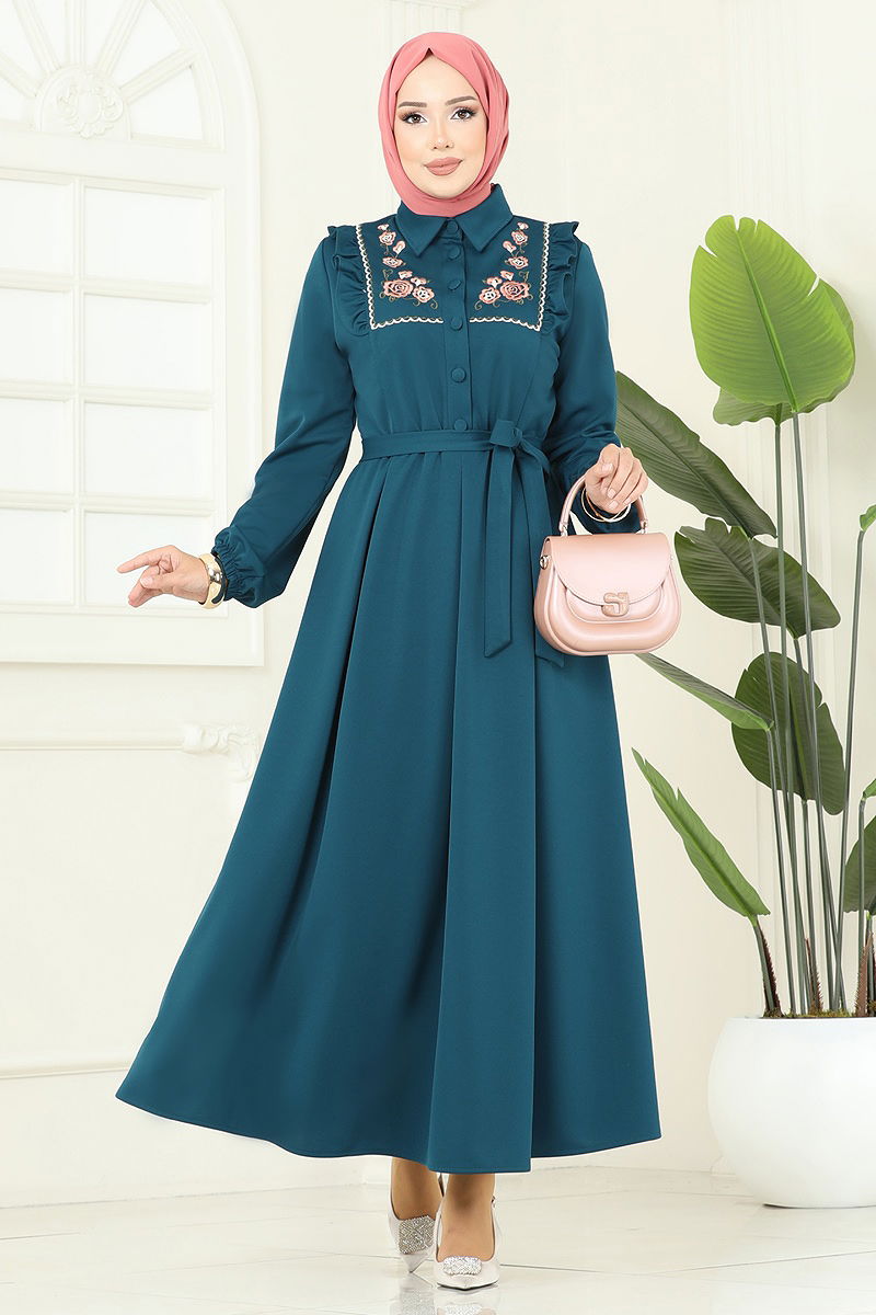 Çiçek Nakışlı Dabıl Elbise 2725SL432 Petrol