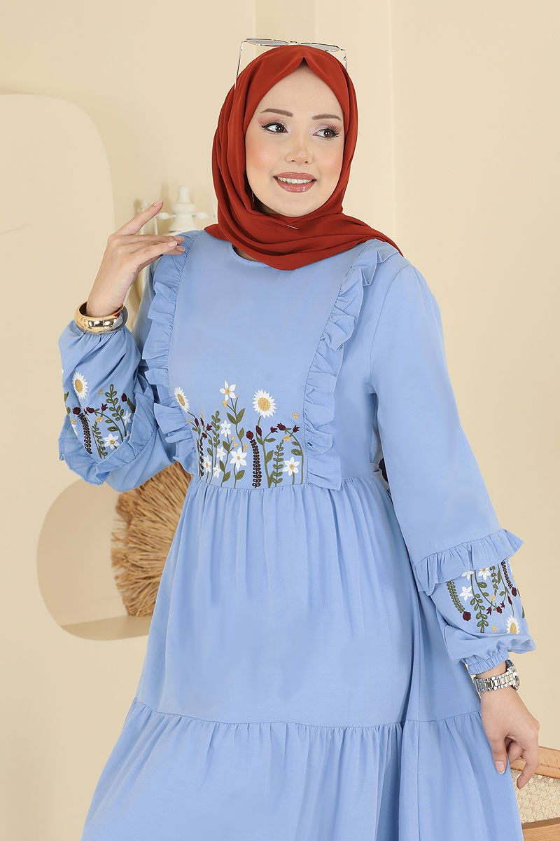 Çiçek Nakışlı Poplin Elbise 327ASN888 Bebe Mavisi