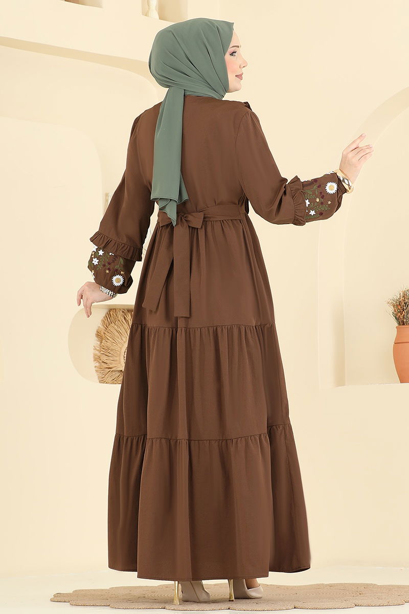 Çiçek Nakışlı Poplin Elbise 327ASN888 Kahve