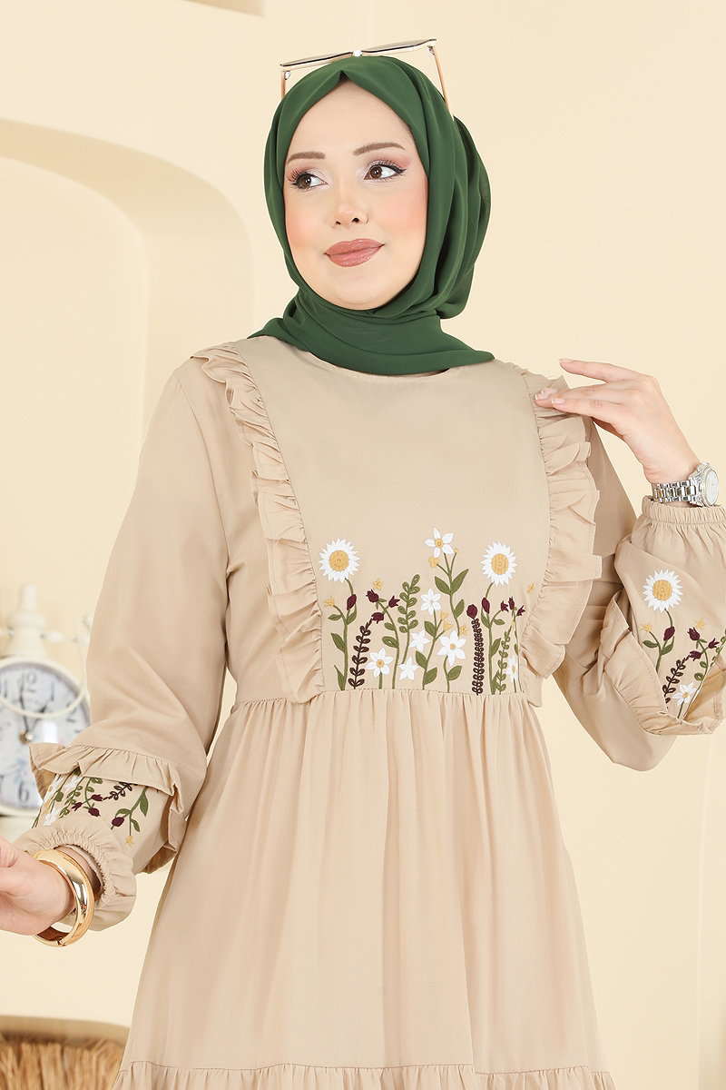 Çiçek Nakışlı Poplin Elbise Taş
