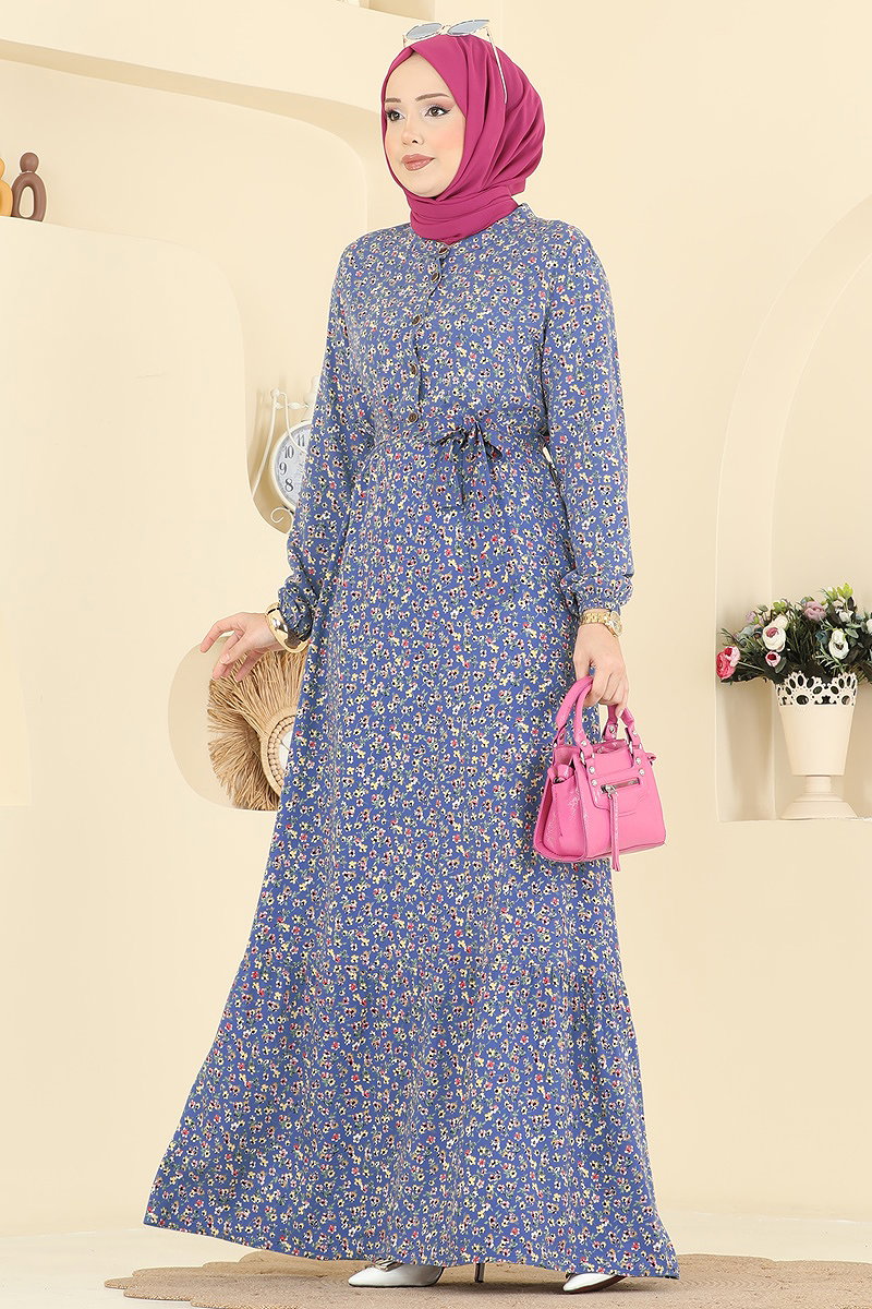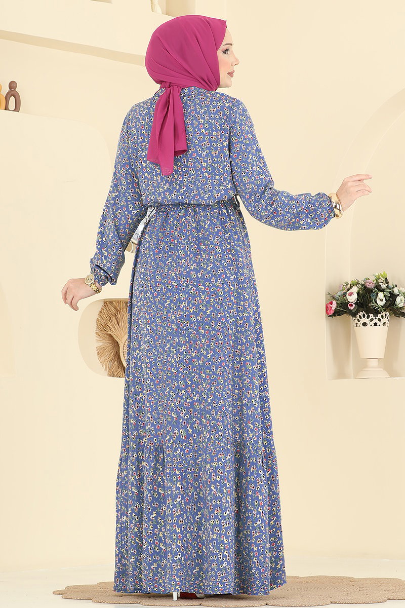 Çiçekli Kuşaklı Viskon Elbise 4098ZNNK1102 İndigo