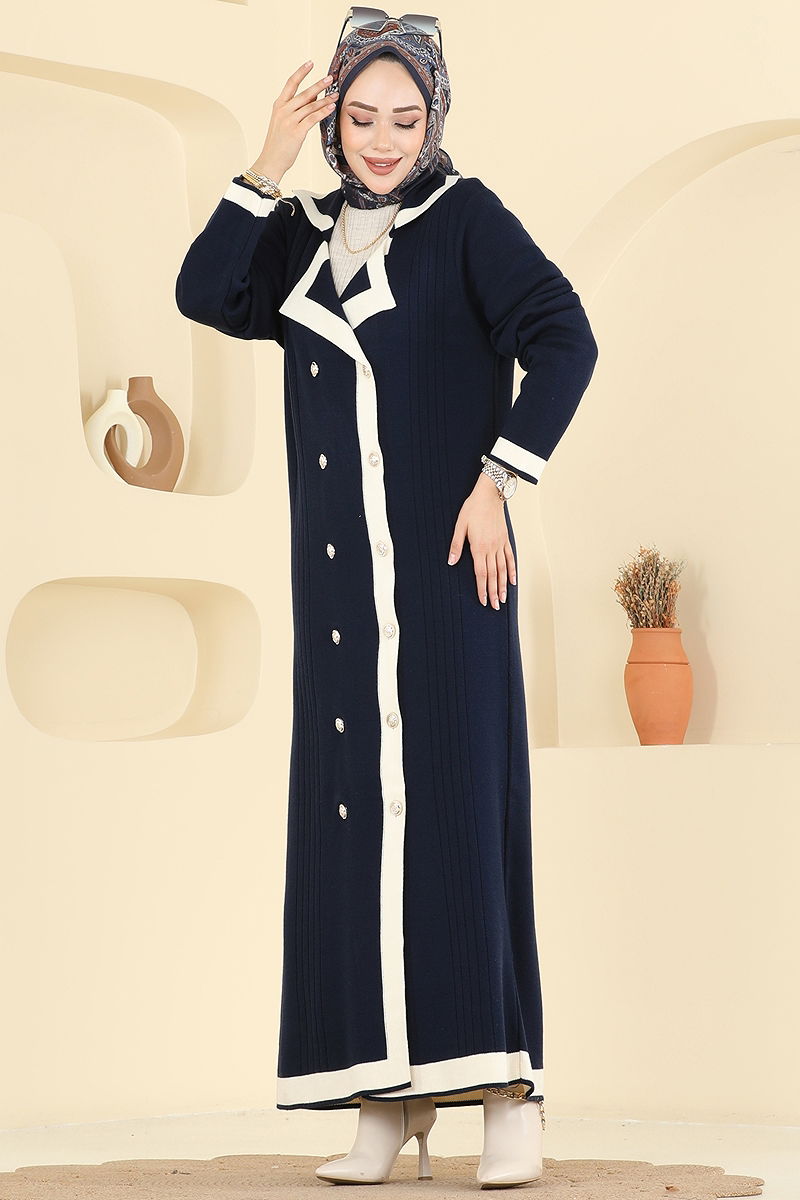 Çift Düğmeli Triko Elbise, modern ve şık tesettür moda anlayışını öne çıkaran bir üründür. Sonbahar ve kış aylarında ısıtıcı konfor sağlayan bu elbise, triko kumaşından üretilmiş olup kare yaka tasarıma sahiptir. Önden düğmeli ve astarsız olan bu model, hassas yıkama ile 30 derecede yıkanabilir. Hem günlük kullanım hem de özel günler için ideal bir seçimdir.