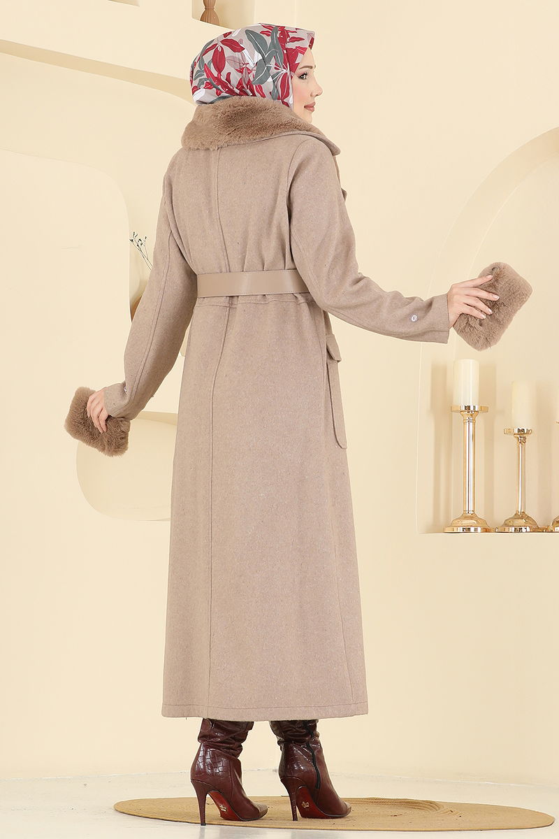 Ürün Özelliği : Yeni sezon tesettür moda ürünüdür. Önden kullanılabilir bir düğmesi bulunmaktadır. Ürün Kürk yakadır. Astarsızdır. Ürün beli dikişlidir. Kürk yaka ve manşetler ürüne dahildir, isteğe bağlı kullanılmayabilir. Kemer ürüne dahildir, isteğe bağlı kullanılmayabilir. Cep mevcuttur. Manşeti kürklüdür.Konsept fotoğraf çekimlerinden dolayı üründe ton farklılığı olabilir.