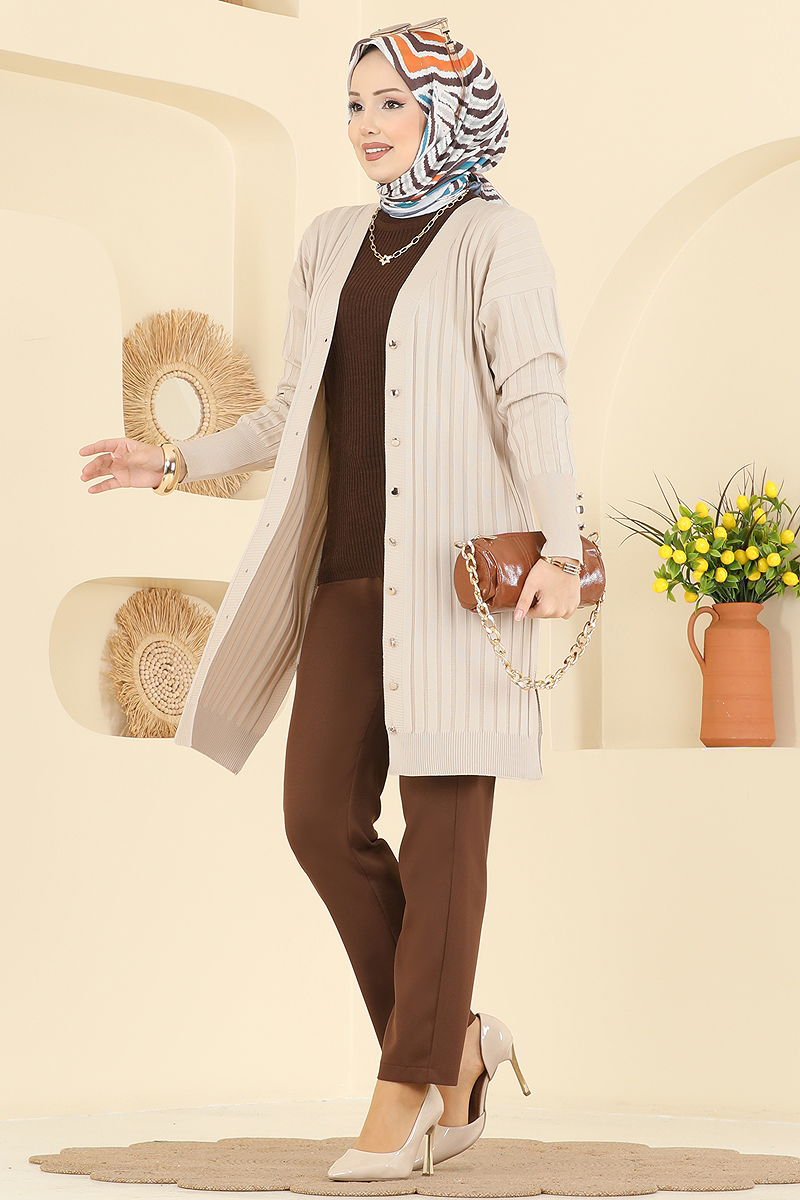 Çizgi Desenli Merserize Triko Hırka Taş