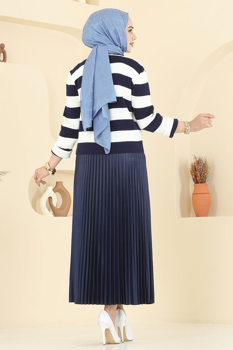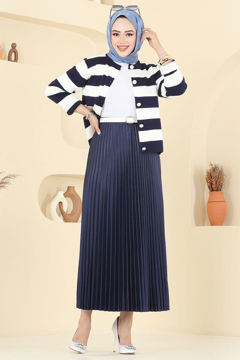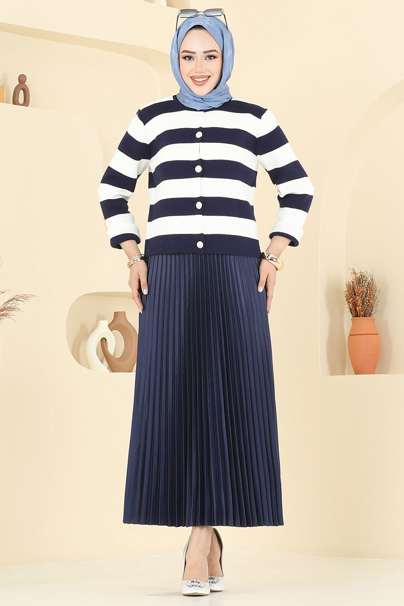 Çizgi Detay Hırkalı Takım, modern ve şık tasarımıyla dikkat çekiyor. Sonbahar ve Kış ayları için ideal olan bu tesettür takım, triko ve saten kumaş kombinasyonuyla konfor ve zarafeti bir arada sunuyor. 30 derecede hassas yıkama ile temizlenebilir. Bisiklet yakası ve ön düğmeleri ile pratik bir kullanım sağlar. Etek lastikli beli sayesinde gün boyu rahat bir kullanım sunar. Ürün astarsızdır ve model üzerindeki Etek S-M bedendir. Hırka Standarttır.