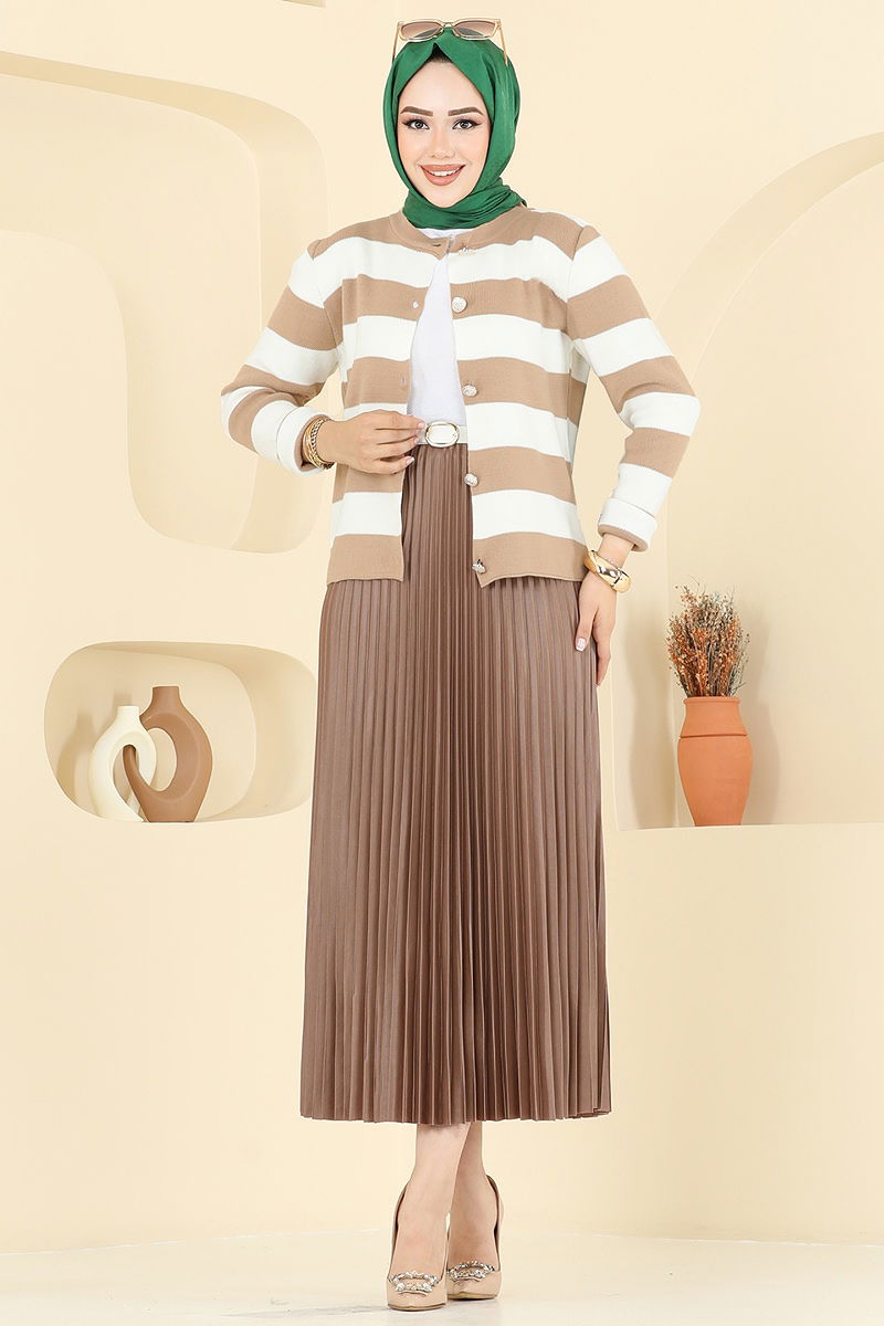 Çizgi Detay Hırkalı Takım, modern ve şık tasarımıyla dikkat çekiyor. Sonbahar ve Kış ayları için ideal olan bu tesettür takım, triko ve saten kumaş kombinasyonuyla konfor ve zarafeti bir arada sunuyor. 30 derecede hassas yıkama ile temizlenebilir. Bisiklet yakası ve ön düğmeleri ile pratik bir kullanım sağlar. Etek lastikli beli sayesinde gün boyu rahat bir kullanım sunar. Ürün astarsızdır ve model üzerindeki Etek S-M bedendir. Hırka Standarttır.