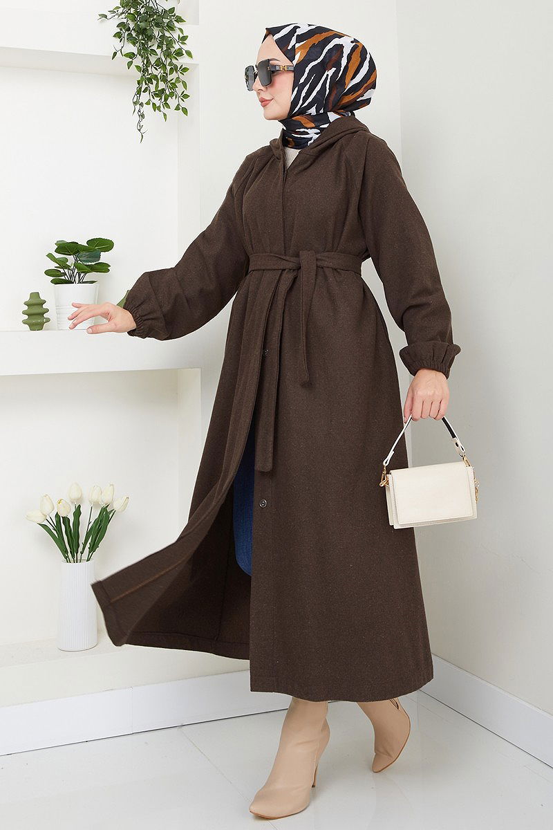 The Hooded Coat with Elastic Cuffs is a model designed to be used in the fall and winter season. It should be washed without squeezing at 30 degrees and it is made of first-class Kaşe fabric. The product has a bicycle neck cut and is unlined. The product on the model is one size. It is suitable for 170 cm height, 90 cm bust, 70 cm waist, 99 cm hips, and 50 kg weight. There are front-usable buttons, and the two ends of the belt are sewn to prevent fluttering, the middle part is left empty (seamless). The belt is included with the product and can be optionally used. The hood is sewn to the product and there is a pocket. The cuff is elastic.