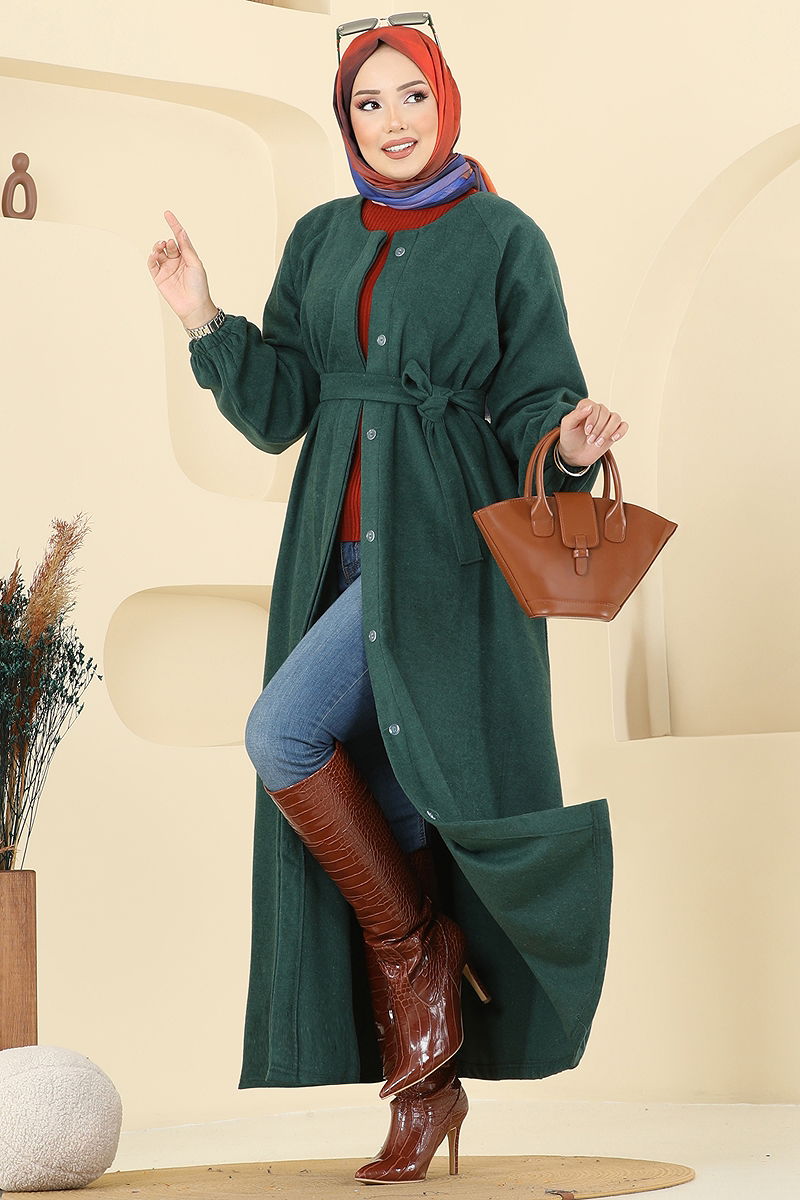 Buttoned Cashmere Coat model is a suitable attire for modest fashion in the autumn and winter seasons. It is recommended to be washed at 30 degrees without wringing. Made from first-class cashmere fabric, it features a bicycle collar design and has no lining. It has usable buttons in the front and the two ends of the belt are sewn to prevent flapping, with the middle part left empty (seamless). The belt is included with the product and is optional for use. It has a pocket detail and elastic cuffs. The product is one size and suitable for the model.