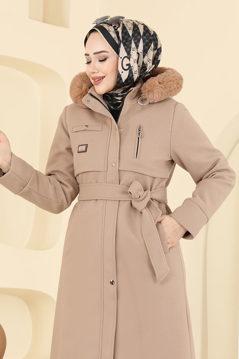 Chic and Functional: The Mandarin Collar Wool Coat is perfect for keeping your autumn and winter stylish and warm. Combining modern and conservative styles with its hijab design, this coat is suitable for autumn and winter seasons. Made from high-quality wool fabric and featuring a lining, it should only be dry cleaned. With its removable hood, and both snap and zipper details, it offers a user-friendly design. Zipper accessories, stitched fur detail, and emblem enhance your elegance. It also includes practical pockets for your convenience.