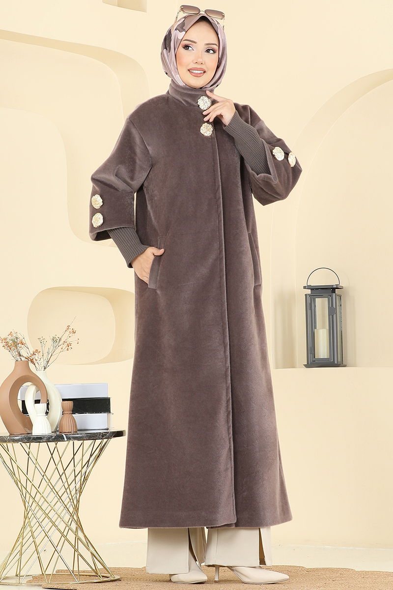 Keep warm and stylish during the autumn and winter seasons with our High Collar Angora Coat, perfect for modest attire. This coat is made from high-quality angora fabric and features an elegant high collar and decorative cuff links. Lined for additional comfort, it is both functional and stylish with its prominently placed buttons. Care is a breeze with dry cleaning only. Stay warm and elegant through the winter months.