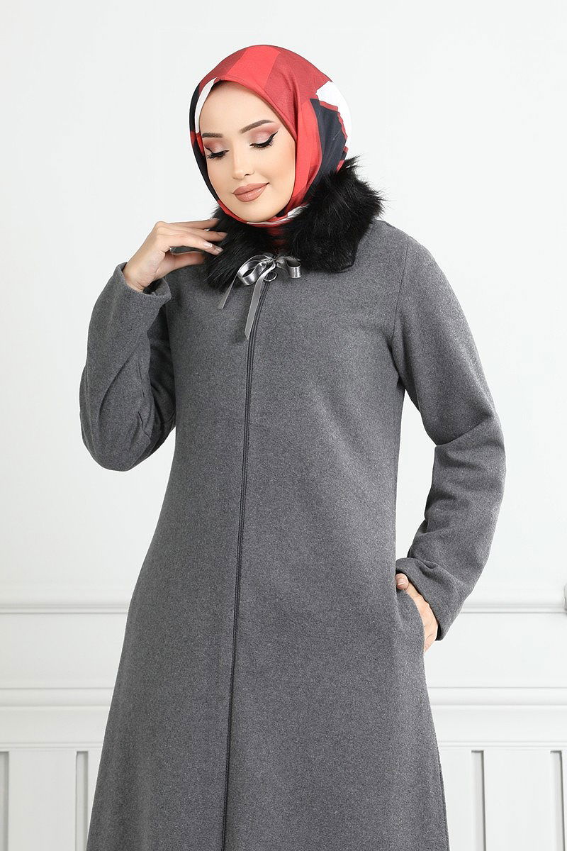 Fur Collar Coat model is a modest fashion product. It can be used in Autumn and Winter seasons. It can be washed at 30 DEGREES WITHOUT SQUEEZING (DELICATE WASH). It is made of cashe fabric. The product has a Fur collar. The product is front zippered. (The product on the model is size 38.) Fur collar is included in the product and can be optionally used. There is a pocket.