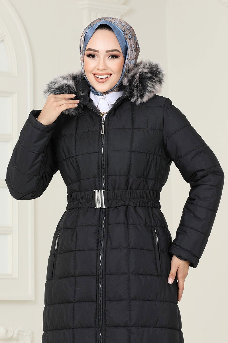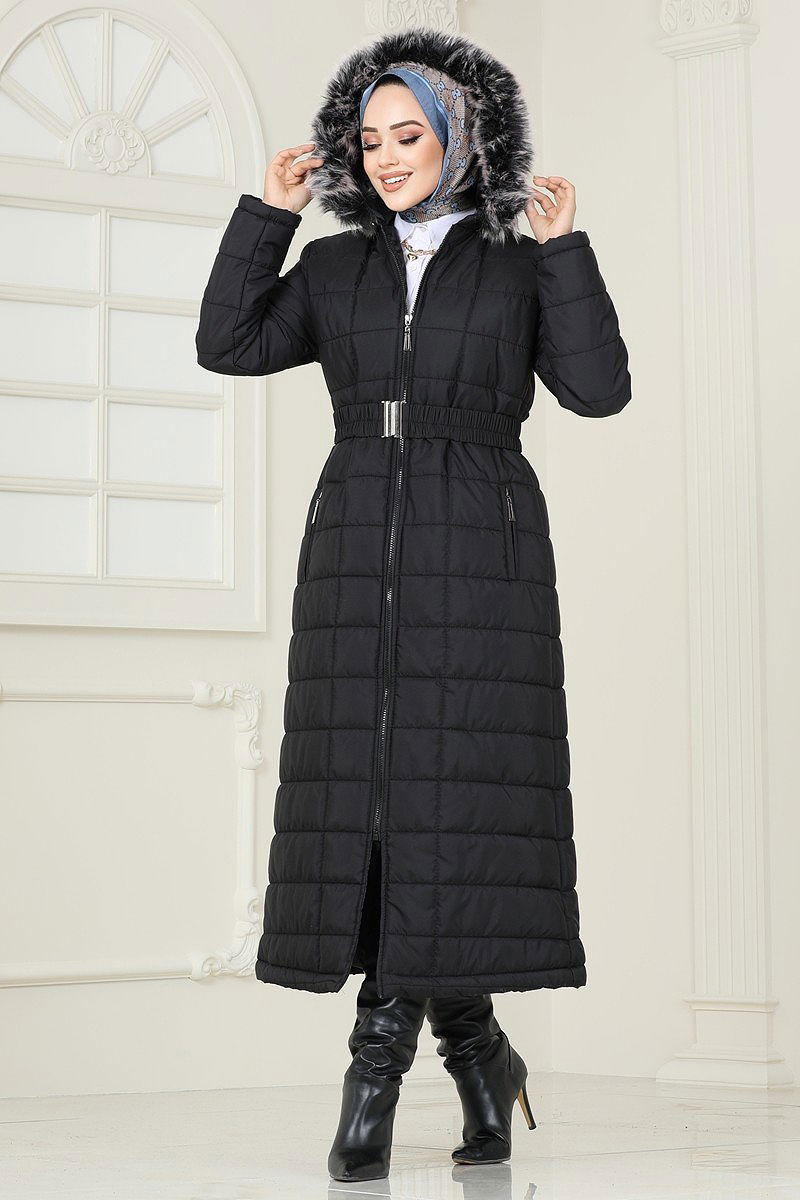 Product Feature : It is a new season hijab fashion product. The product has a Hooded collar. It is lined.. The product has a zipper at the From the front part. The fur is sewn into the product. The hood is sewn to the product. Belt included, optional not available. Pocket available. There may be a tonal difference in the product due to concept photo shoots.