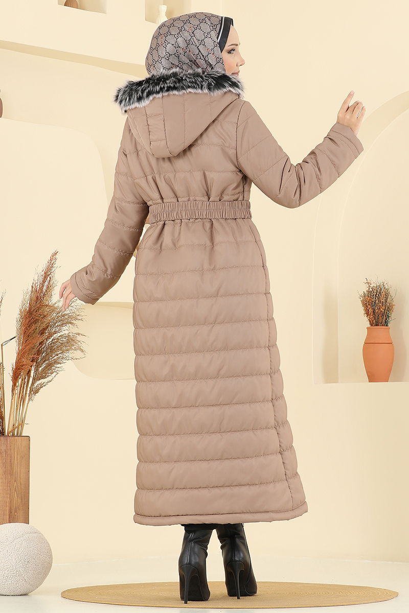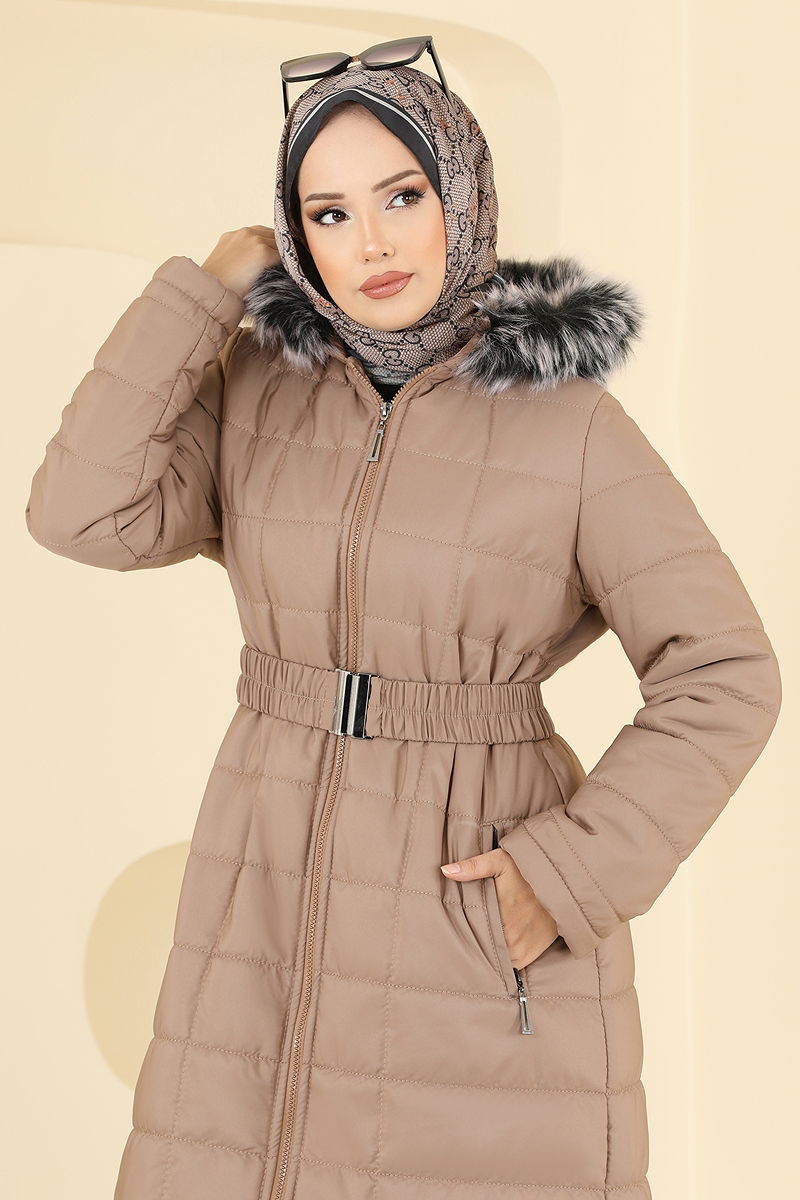 Product Feature : It is a new season hijab fashion product. The product has a Hooded collar. It is lined.. The product has a zipper at the From the front part. The fur is sewn into the product. The hood is sewn to the product. Belt included, optional not available. Pocket available. There may be a tonal difference in the product due to concept photo shoots.