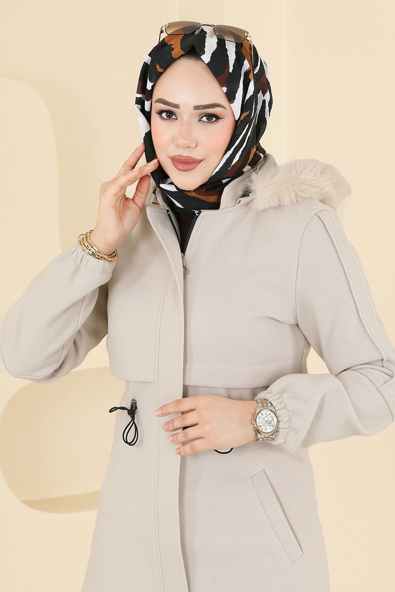Product Feature : It is a new season hijab fashion product. The hood is detachable and can be used optionally. The product has a Upright collar. Unlined. The product has a zipper at the From the front part. The product has an elastic waistband. The fur is sewn into the product. The product has a pocket. The cuff is rubberized. There may be a tonal difference in the product due to concept photo shoots.