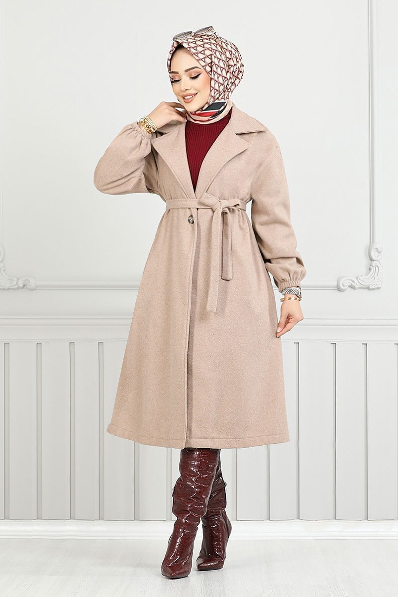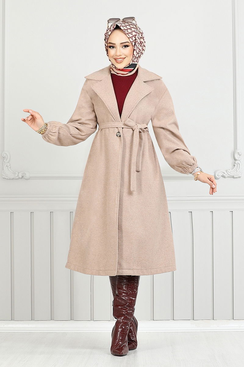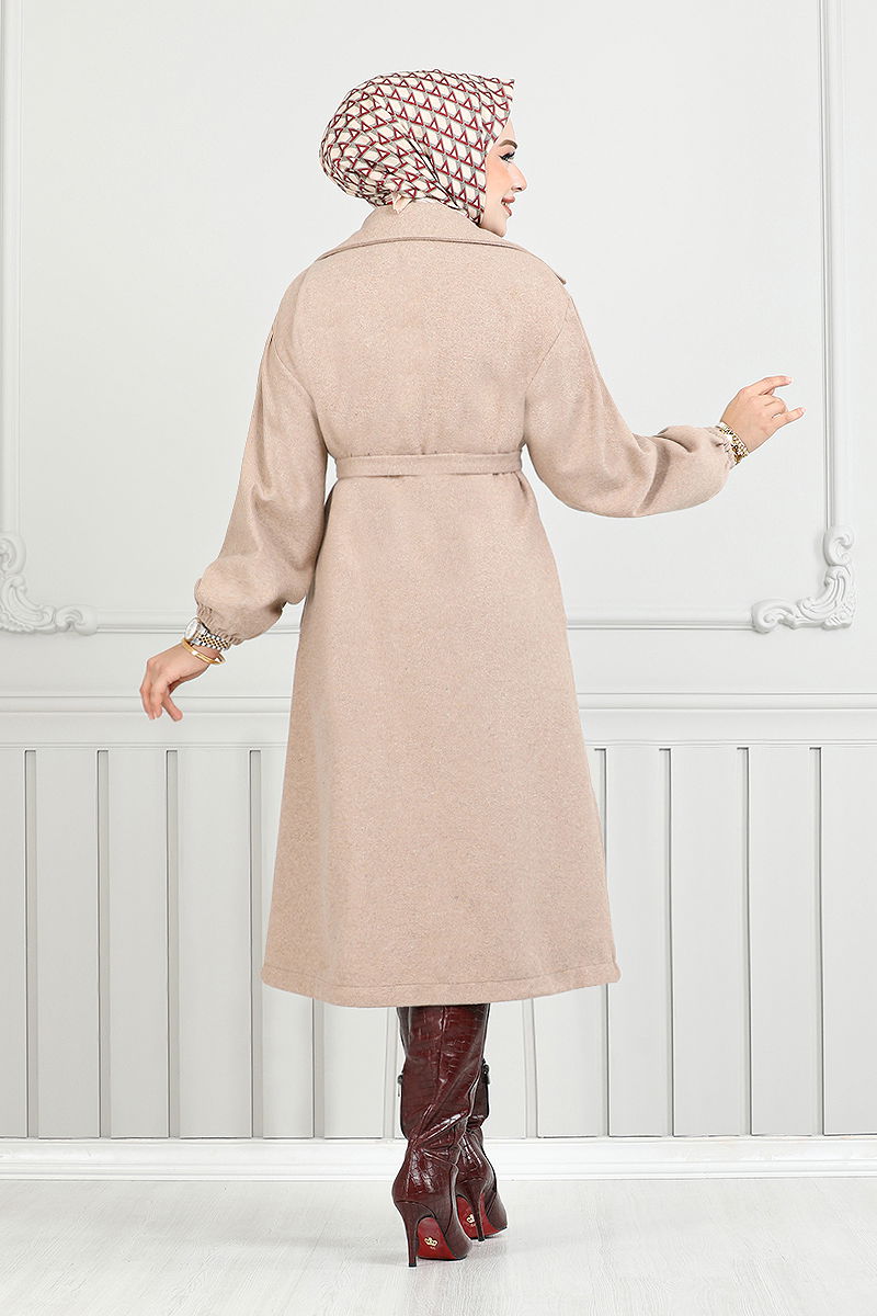 Shawl Collar Woolen Coat is a hijab product. It can be used in Autumn and Winter seasons. It can be washed at 30 DEGREES WITHOUT SQUEEZING. (DELICATE WASH) It is made of woolen fabric. The product has a shawl collar. It is unlined. (The product on the model is size 38.) It has a usable button at the front. It has pockets.