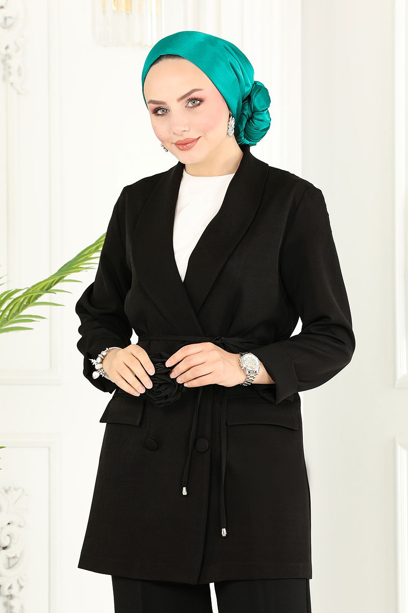 (Unlined.)Double Breasted CollarIt has a functional buttons.Belt is included, can be used optionally.The waist of the pants is elasticThe brooch is included in the product, it may not be used optionally.There may be a tonal difference in the product color due to the concept shots.