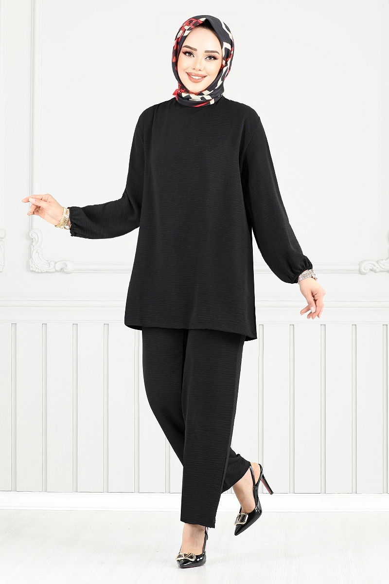 Offering both comfort and style, the Elastic Cuffed Aerobin Set is a modest wear outfit suitable for all seasons. Washable at 30 degrees on a gentle cycle, this garment is made from aerobin fabric. Featuring a bike neckline and an unlined design, this set offers practicality with its back button. The elastic-waisted pants provide a comfortable fit, and together with the tunic, they ensure all-day comfort. This set will keep you stylish in any setting.