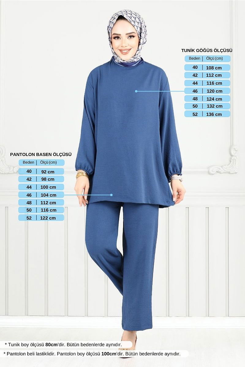 Offering both comfort and style, the Elastic Cuffed Aerobin Set is a modest wear outfit suitable for all seasons. Washable at 30 degrees on a gentle cycle, this garment is made from aerobin fabric. Featuring a bike neckline and an unlined design, this set offers practicality with its back button. The elastic-waisted pants provide a comfortable fit, and together with the tunic, they ensure all-day comfort. This set will keep you stylish in any setting.